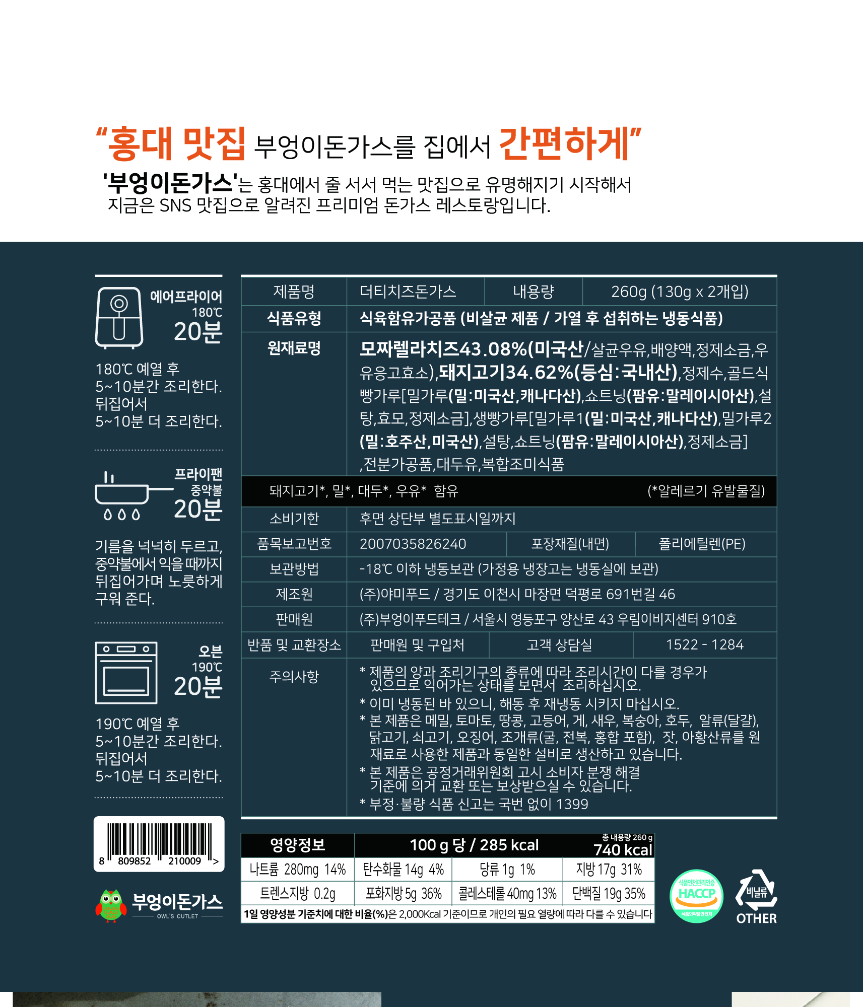 - 모짜렐라치즈 43.08%(미국산/부분탈지우유, 배양액, 정제소금, 우유응고효소), 돼지고기 34.62%(등심:국내산), 정제수, 생빵가루, 골드식빵가루, 프리미엄배터믹스, 대두유, 복합조미식품