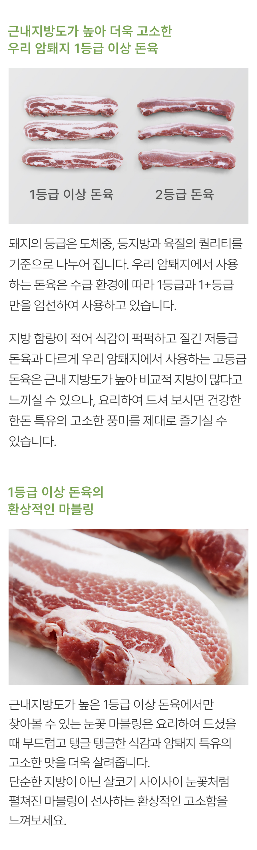 - 1등급이상 암퇘지의 경우 수퇘지 또는 거세돈에 비해 근내지방도가 높습니다. 지방이 많다고 느끼실 수 있으나, 요리하여 드셔보시면 차원이 다른 고소함을 느끼실 수 있습니다.