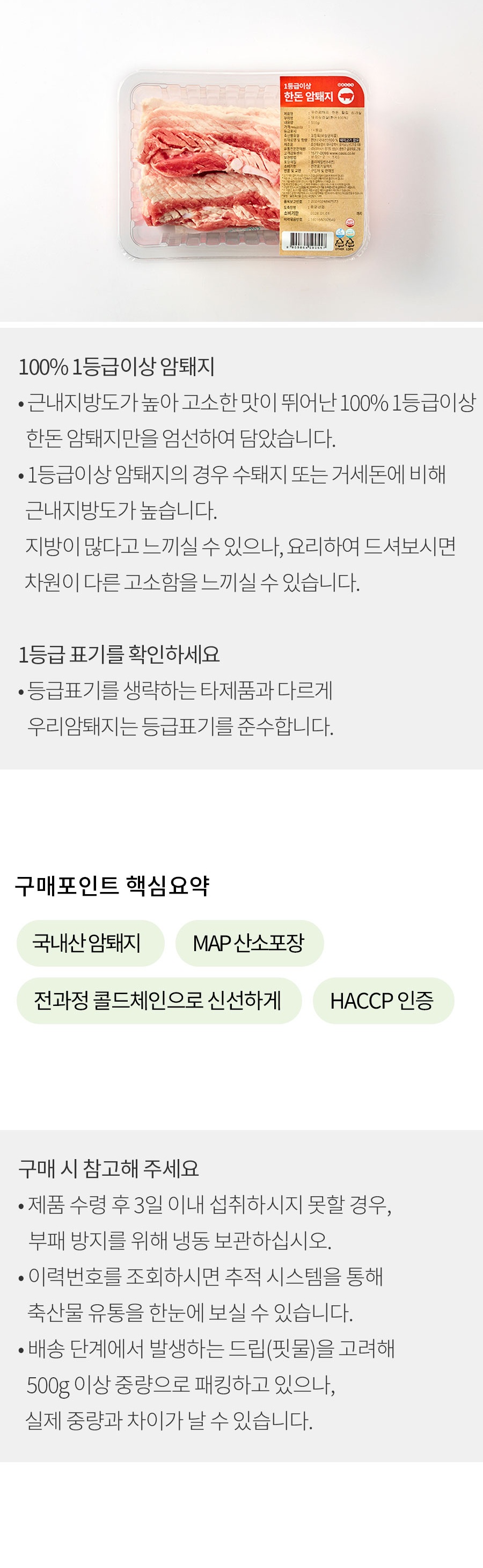 - 배송 단계에서 발생하는 드립(핏물)을 감안하여 500g 이상 중량으로 패킹하고 있으나, 실제 중량과 차이가 날 수 있습니다.