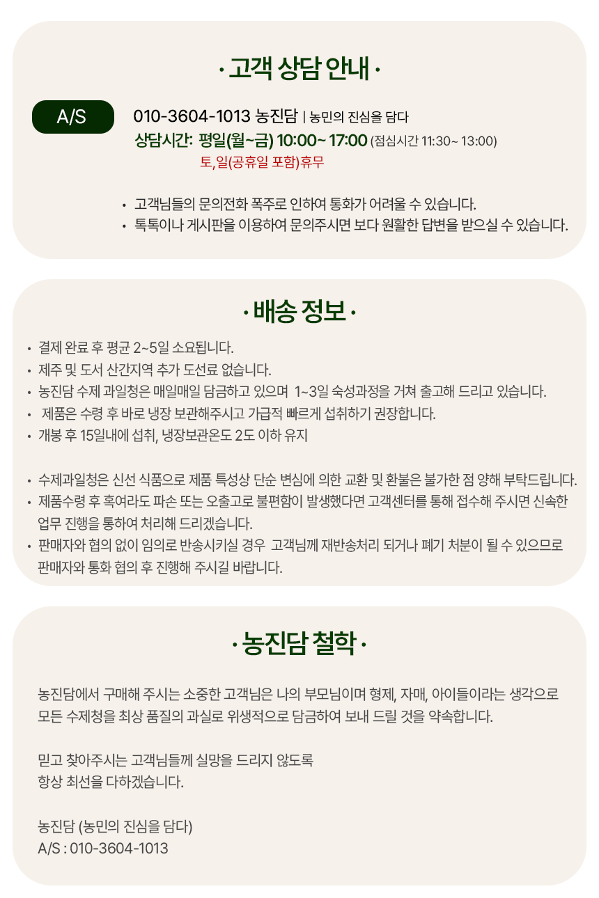 신선냉장식품으로 제품하자 이외의 단순변심 등으로 인한 교환 취소 환불은 불가합니다