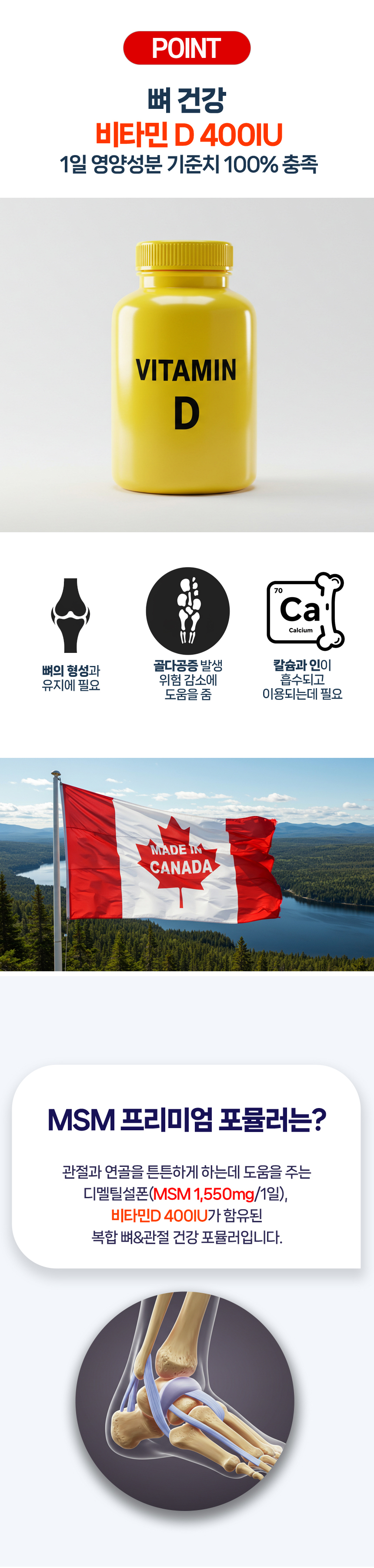 관절 및 연골 건강에도 도움을 줄 수 있음, 칼슘과 인이 흡수되고 이용되는데 필요, 뼈의 형성과 유지에 필요, 골다공증발생과 위험 감소에 도움을 줌