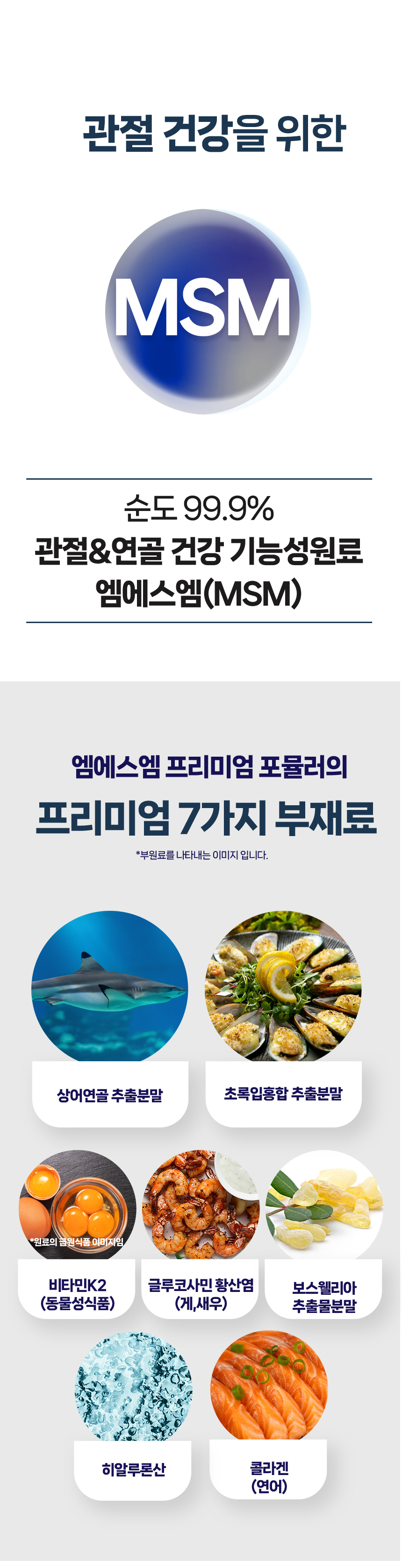 엠에스엠(MSM), 비티만D3, 결정셀룰로스, 초록입홍합추출분말, 글루코사민황산염(게,새우), 상어연골추출분말, 스테아린산마그네슘, 콜라겐(연어), 보스웰리아추출분말, 히알루론산, 비타민K2