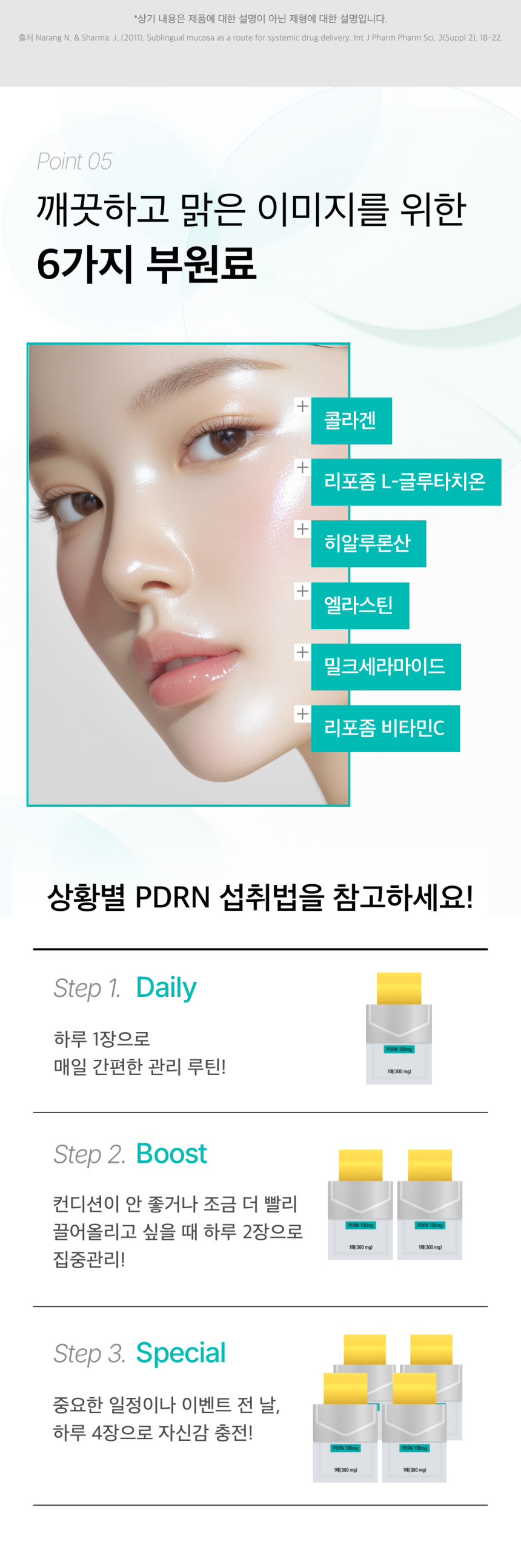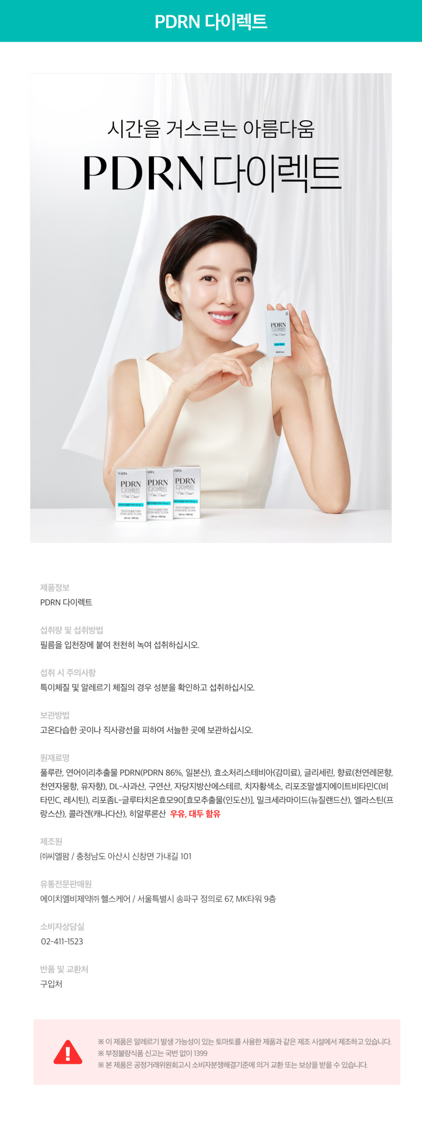 풀루란, 연어이리추출물 PDRN(PDRN 86%, 일본산), 효소처리스테비아(감미료), 글리세린, 향료(천연레몬향, 유자향), DL-사과산, 구연산, 자당지방산에스테르, 치자황색소, 리포조말셀지에이트비타민C(비타민C, 레시틴), 리포좀L-글루타치온효모90[효모추출물(인도산)], 밀크세라마이드(뉴질랜드산), 엘라스틴(프랑스산), 콜라겐(캐나다산), 히알루론산