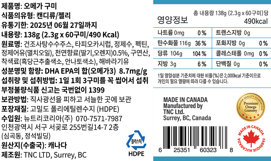 영양성분 : 총 내용량 138g (2.3g X 60구미)당 490kcal, 나트륨 0mg (0%), 탄수화물 116g (36%), 당류 104g (104%), 지방 3g (6%), 트랜스지방 0g, 포화지방 0g (0%), 콜레스테롤 0mg (0g), 단백질 0g (0%)지표성분 : DHA EPA의 합(오메가3) 8.7mg/g