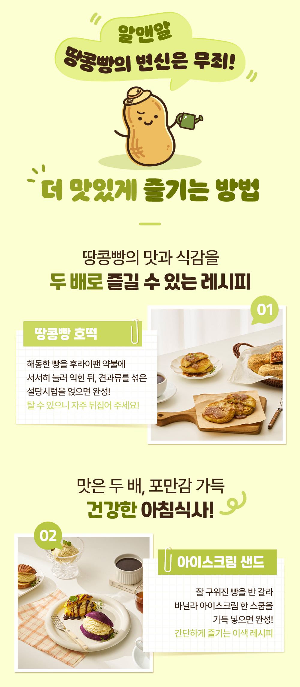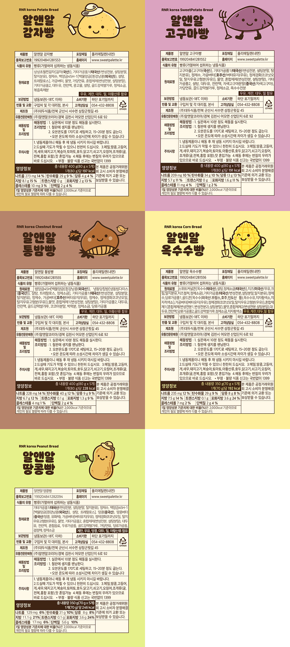 1봉 400g(80g 5개입): 감자빵, 고구마빵, 통밤빵, 1봉 350g(70g 5개입): 옥수수빵, 땅콩빵