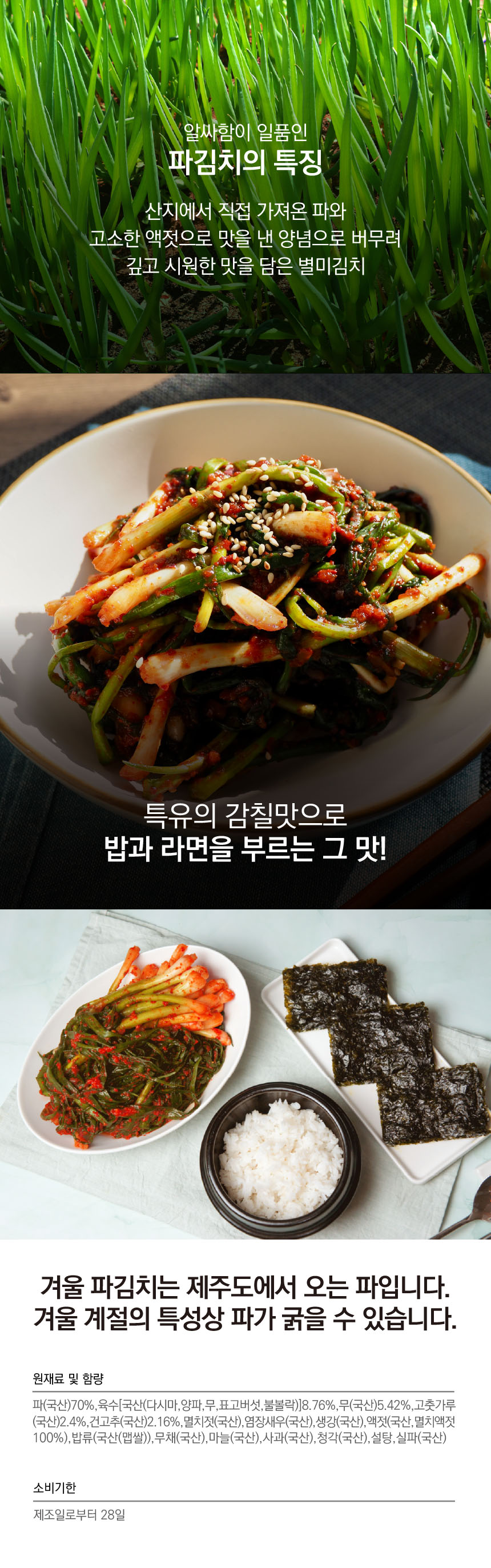 파(국산)70%,육수[국산(다시마,양파,무,표고버섯,불볼락)]8.76%,무(국산)5.42%,고춧가루(국산)2.4%,건고추(국산)2.16%,멸치젓(국산),염장새우(국산),생강(국산),액젓(국산,멸치액젓100%),밥류(국산(맵쌀)),무채(국산),마늘(국산),사과(국산),청각(국산),설탕,실파(국산)