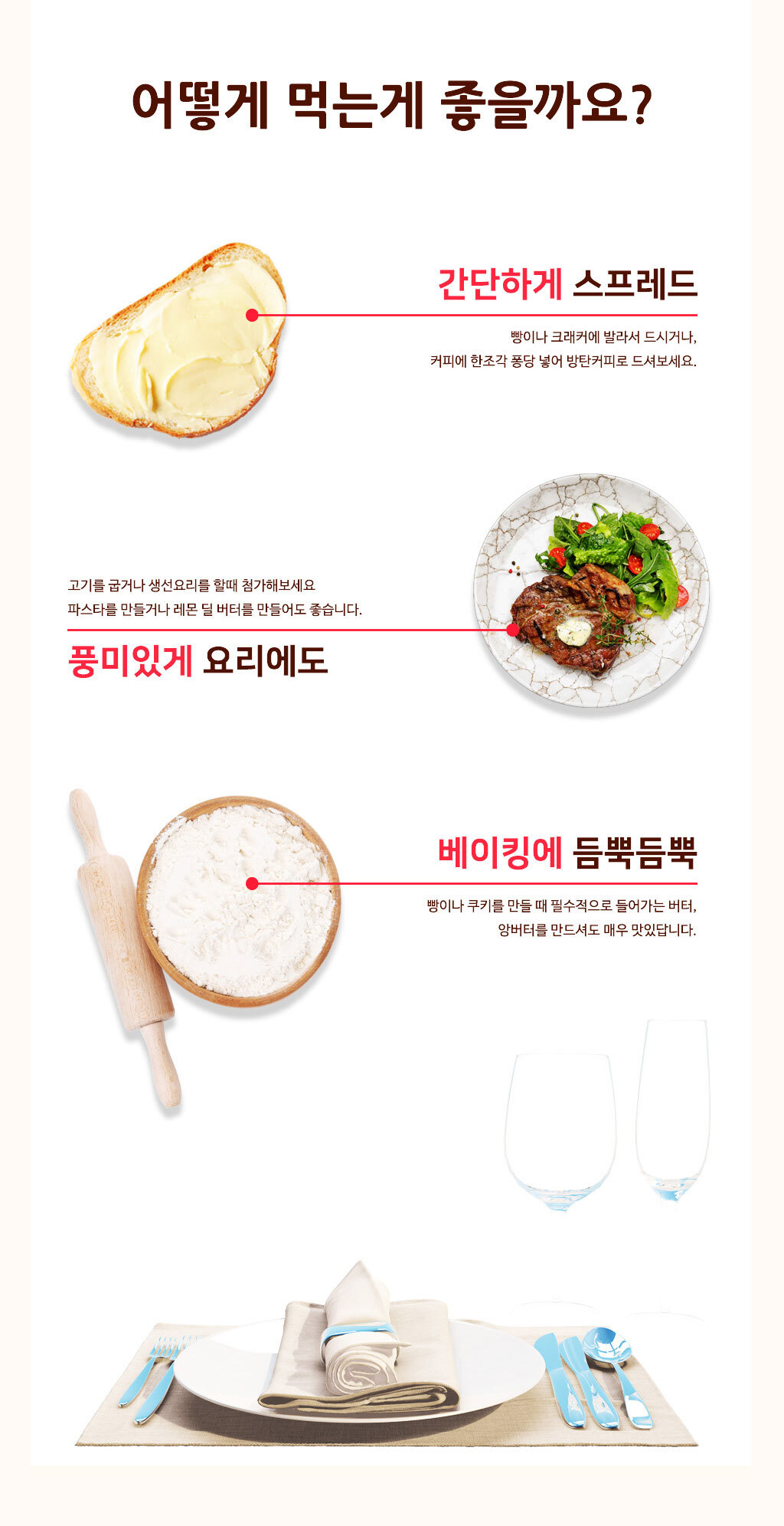 단 하나의 명품버터, 부드럽게 녹아드는 텍스쳐와 은은하게 퍼지는 향.