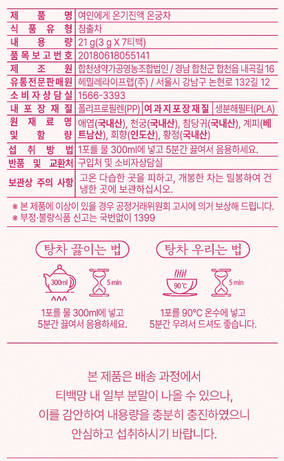 [신규특가] 김소형원방 여성건강 온궁차 티백 (3g, 7개입)