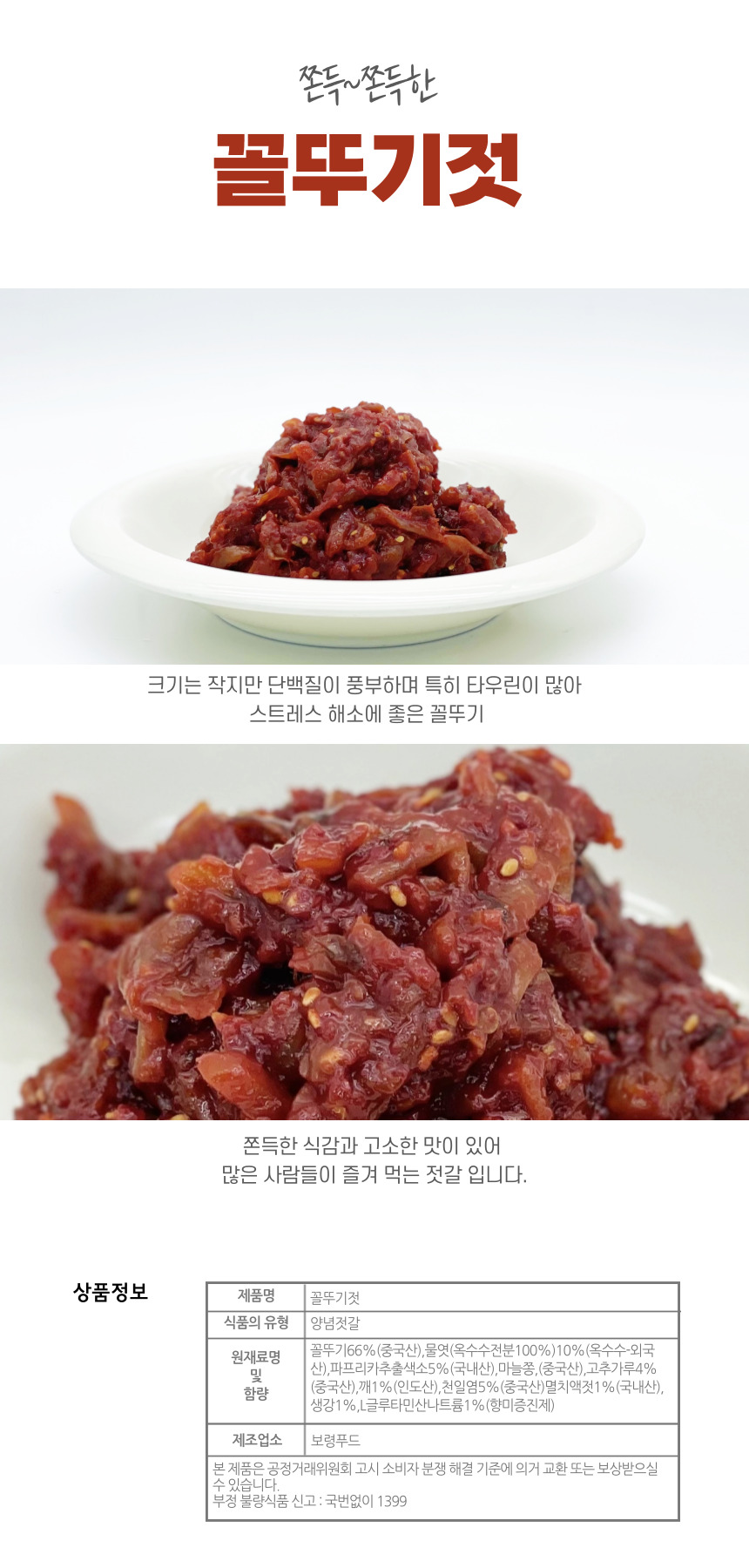 꼴뚜기(중국산)66%, 천일염(국산)5%, 생강(국산)1%, 고춧가루(건고추,중국산)4%, 참깨(인도산)1%, 마늘(국산)3%, 물엿(중국산)10%, 액젓(국산)1%, 마늘쫑(중국산)3%, 파프리카추출색소5%, L-글루타민산나트륨1%(향미증진제)