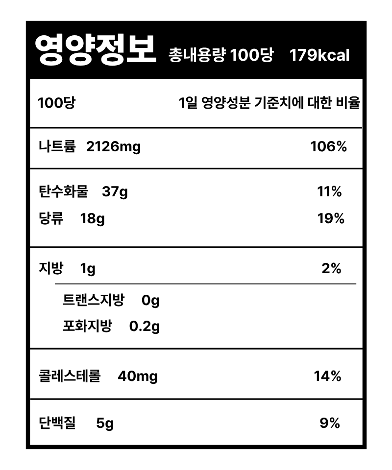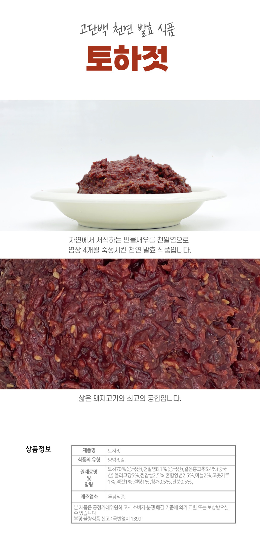 토하70%(중국산),천일염8.1%(중국산),갈은홍고추5.4%(중국산),올리고당5%,찐찹쌀2.5%,혼합양념2.5%,마늘2%,고츗가루1%,액젓1%,설탕1%,참깨0.5%,전분0.5%,L-글루타민산나트륨(향미증진제)0.5%