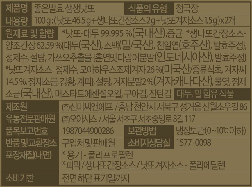 *낫또-대두 99.995%(국내산),종균 *생나또간장소스양조간장 62.59 %{대두(국산), 소맥(밀/국산), 천일염(호주산), 발효주정}, 정제수, 설탕, 가쓰오추출물 {훈연맛다랑어분말(인도네시아산), 발효주정} *낫또겨자소스- 정제수, 모아하우스조제겨자 26 %{미국산/증류식초, 겨자씨
