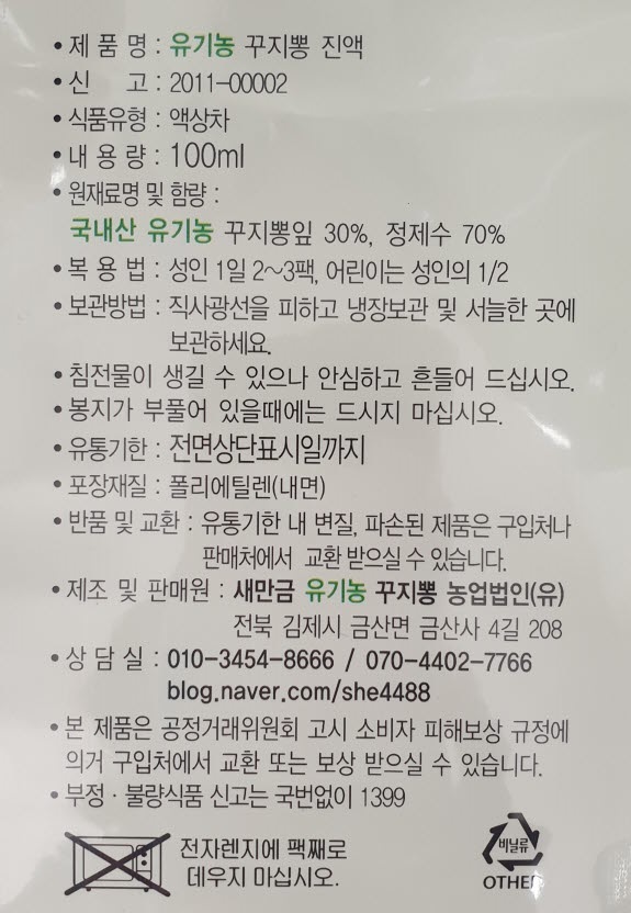 유기농 꾸지뽕 추출액100% (유기농 꾸지뽕 잎 30%, 정제수 70%)