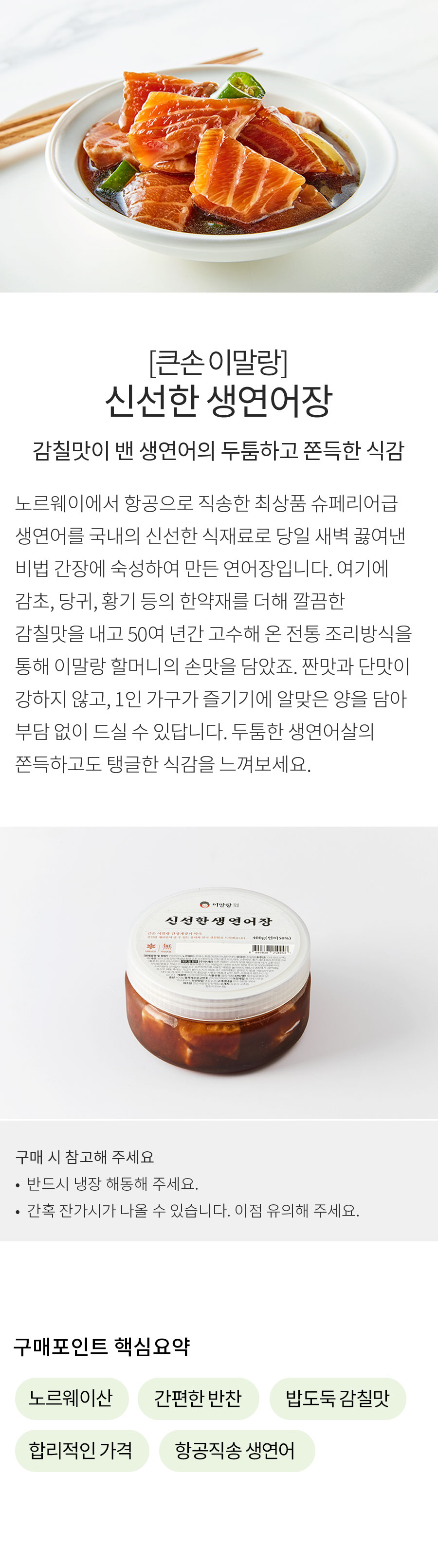 - 연어(노르웨이)50%, 정제수, 조선간장(정제수, 메주(대두100%) [외국산(미국, 캐나다산, 호주산)], 천일염, 발효주정, 대두함유, 양조간장(정제수, 탈지대두[외국산(인도, 미국)], 소맥, 천일염, 발효주정, 효모추출분말, 감초추출물), 감초(국산), 당귀(국산), 황기(국산), 디포리(국산), 대추(국산), 무(국산), 양파(국산), 생강(국산), 통마늘(국산), 마른청양고추(국산), 생청양고추(국산), 고추씨앗(국산), 황태(러시아), 설탕, 천연향신료(통후추), 배(국산), 사과(국산)