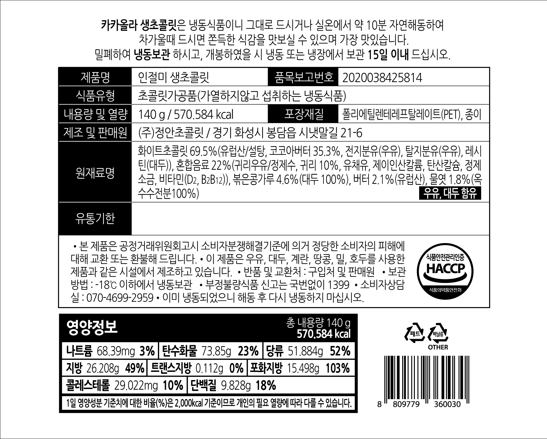화이트 초콜릿 69.5%(유럽산/설탕, 코코아버터 35.3%, 전지분유(우유), 탈지분유(우유), 레시틴(대두)), 혼합음료 22%(귀리우유/정제수, 귀리 10%, 유채유, 제이인산칼륨, 탄산칼슘, 정제소금, 비타민(D2, B2, B12)), 볶은콩가루 4.6%(대두 100%), 버터 2.1%(유럽산), 물엿 1.8%(옥수수전분 100%)