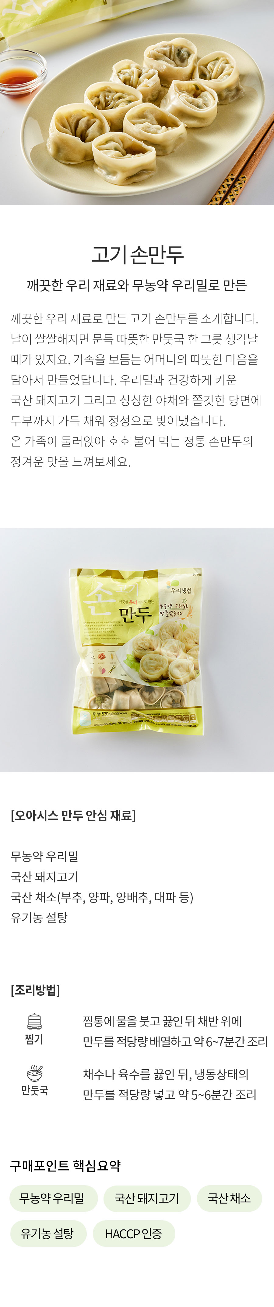 - 무농약밀가루 27,12%(국산), 돼지고기 19.30%(국산), 부추11.58%(국산), 양파 11.58%(국산), 양배추5.78%(국산),건면, 대파, 콩단백, 마늘, 한우참맛, 유기농설탕, 참기름, 정제소금, 콩기름, 생강분말, 후추가루