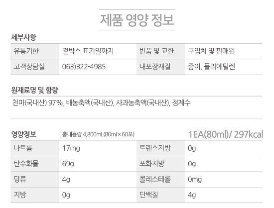 천마(국내산) 97%, 배농축액(국내산, 사과농축액(국내산), 정제수