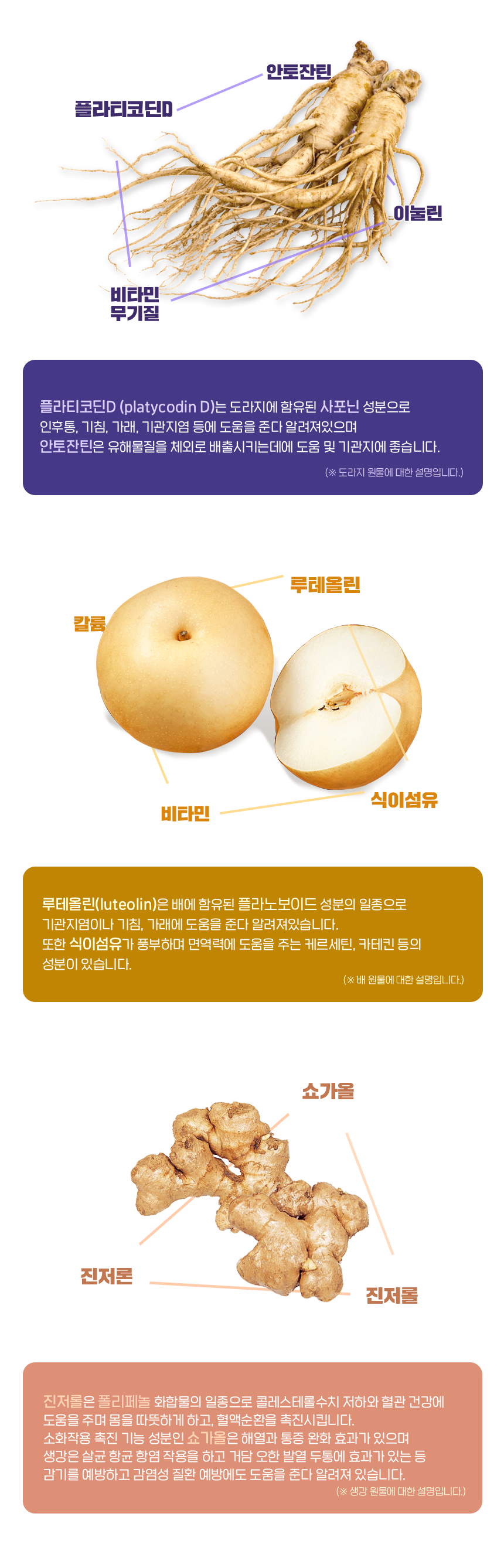 배(국내산) 74.9%, 도라지(국내산, 무농약) 23%, 생강(국내산) 2%, 수세미(국내산, 무농약) 0.1%