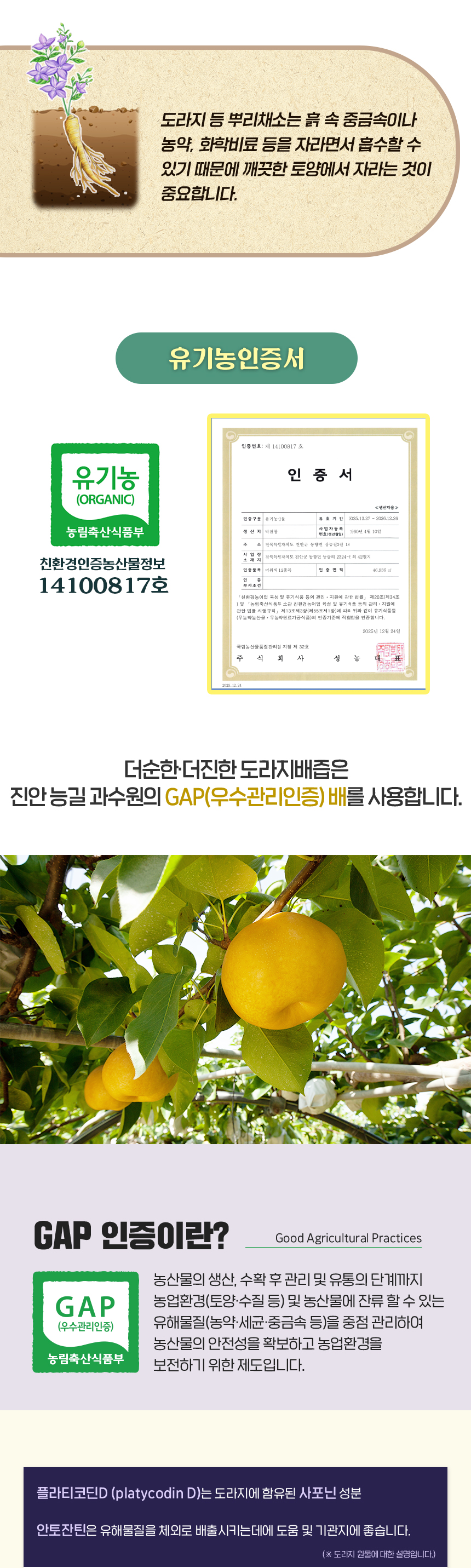 무농약으로 직접 재배하는 3년근 약도라지로 만든 제품, 친환경과 HACCP 인증을 받았으며 가성비가 뛰어남