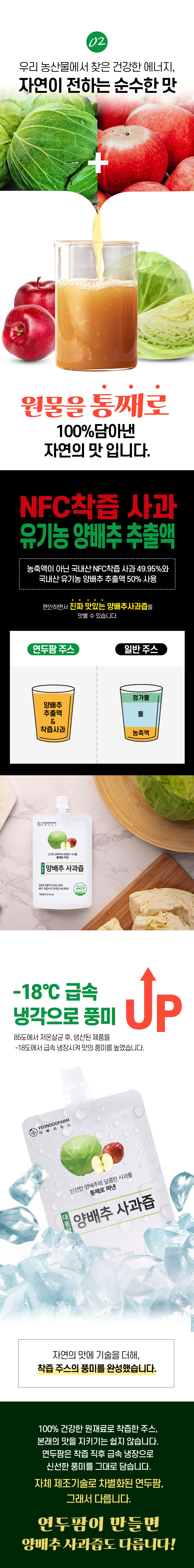 착즙 사과와 유기농 양배추를 1:1 비율로 만들어 맛있게 즐길 수 있는 양배추 사과즙