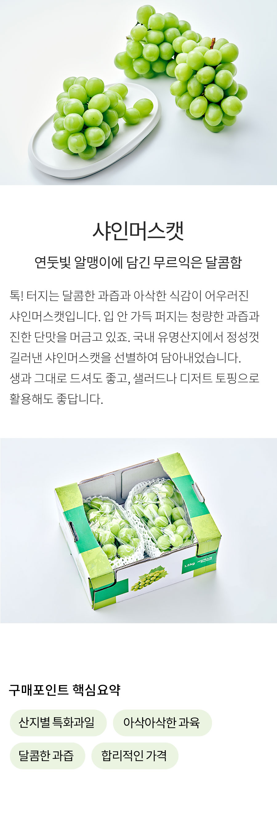 당도선별 샤인머스캣(1.5kg/2-3수) 수량빼기 수량추가 11,900 원 총 수량 1 개 11,900 원 구매옵션 닫기 찜하기 추가 찜하기 삭제 구매후기 0 상품상세 정기구독 장바구니 정기구독 10월 18일 00시 오픈예정 정기배송 장바구니