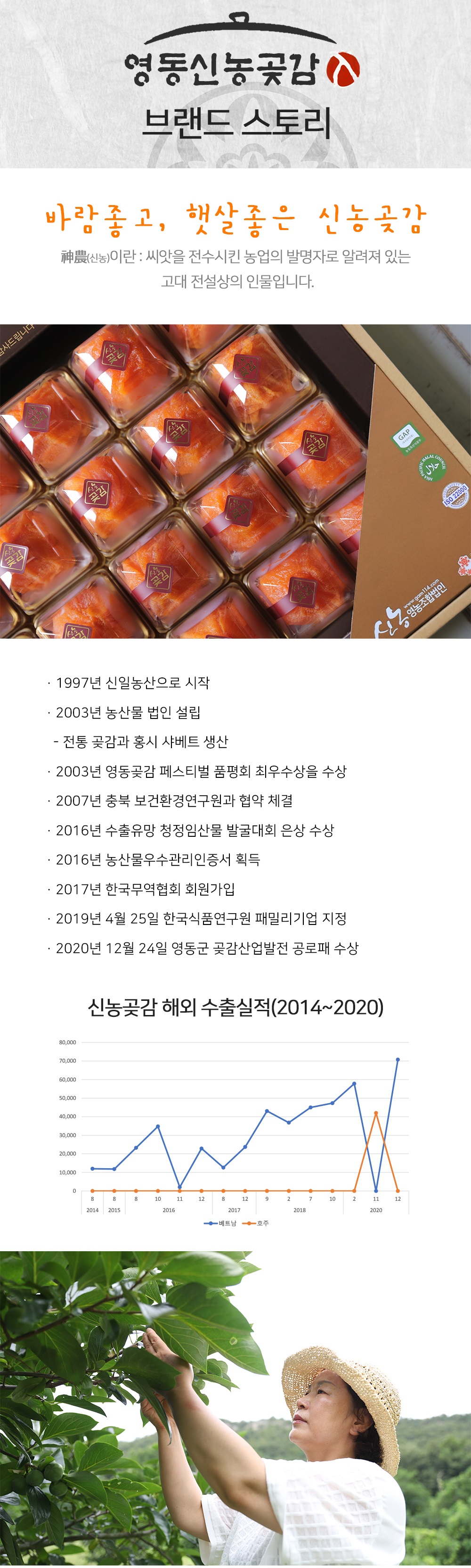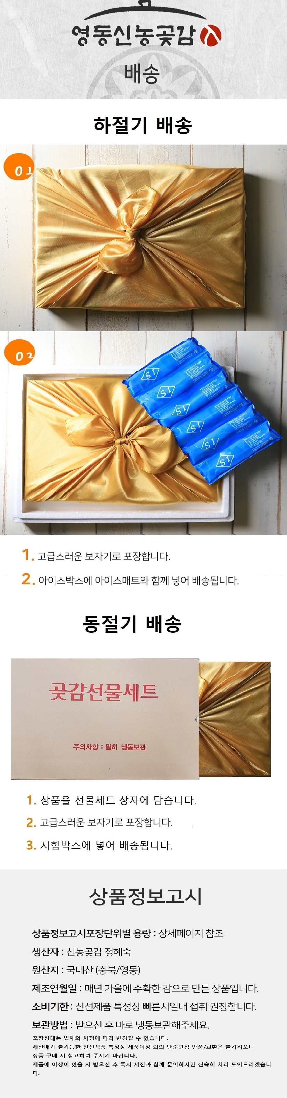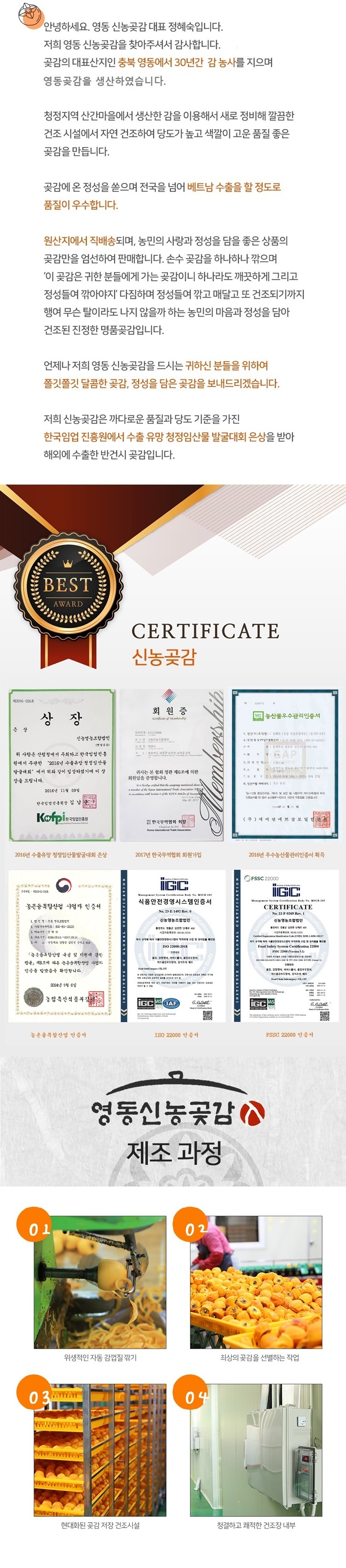 아침과 저녁의 일교차 많은 충북 영동에서 생산한 곶감으로 다른 지역의 곶감보다 더 겉의 아삭아삭 씹히는 식감과 속의 달콤함으로 두가지 즐거움을 느낄 수 있는 건강먹거리