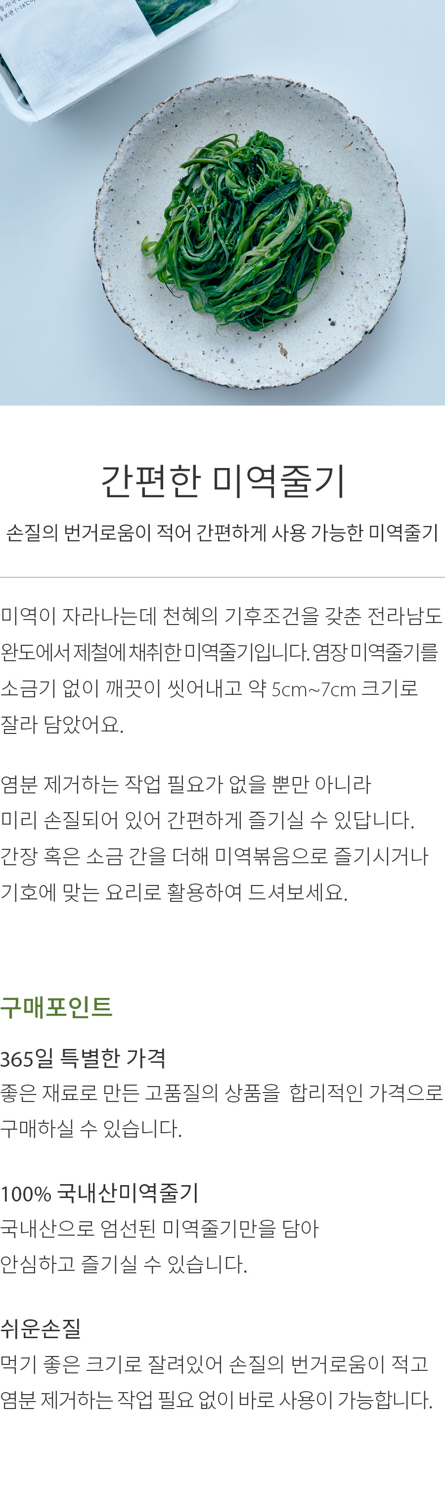 씻어나와 간편한 미역줄기 (200g) 수량빼기 수량추가 3,600 원 총 수량 1 개 3,600 원 구매옵션 닫기 찜하기 추가 찜하기 삭제 구매후기 1,617 상품상세 정기구독 장바구니 정기구독 장바구니 구매하기 정기배송 장바구니