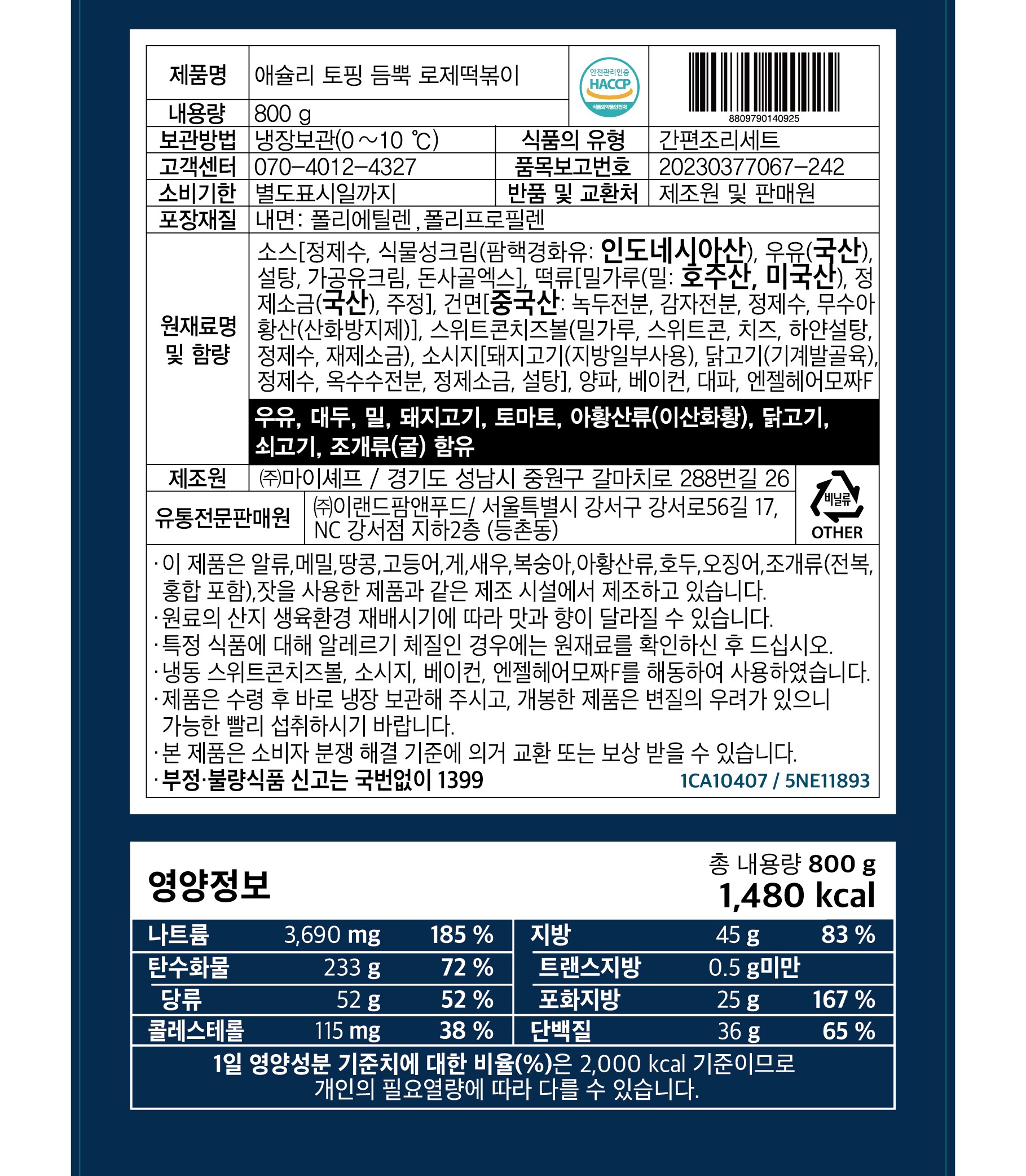 - 애슐리 토핑듬뿍 로제떡볶이(800g)