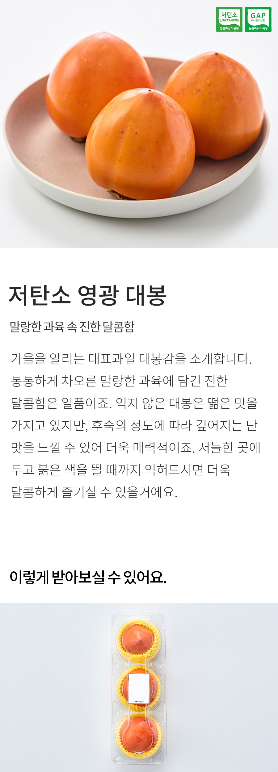 GAP저탄소 대봉감(3입/900g내외) 수량빼기 수량추가 6,000 원 총 수량 1 개 6,000 원 구매옵션 닫기 선물하기 구매후기 266 상품상세 정기구독 장바구니 정기구독 장바구니 구매하기 정기배송 장바구니