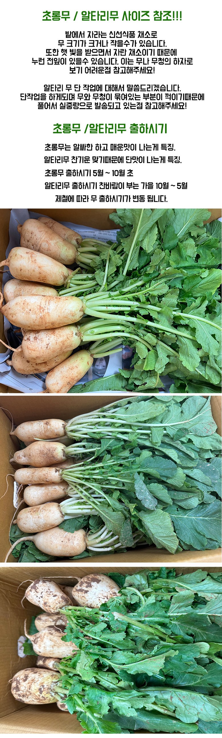 국내산 알타리무 반단 실중량 1.7kg, 알타리무 1단 실중량 3.5kg 내외