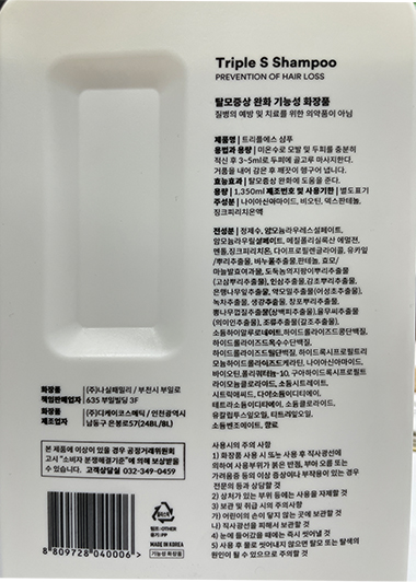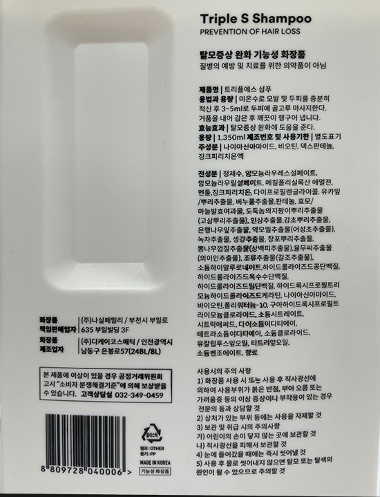 정제수, 암모늄라우레스설페이트,암모늄라우릴설페이트, 메칠폴리실록산에멀젼, 징크피리치온 액 50%, 멘톨, 다이프로필렌글라이콜, 유카잎/뿌리추출물, 비누풀추출물, 효모/마늘발효여과물, 도둑놈의지팡이뿌리추출물(고삼뿌리추출물), 인삼추출물, 감초뿌리추출물, 은행나무잎추출물, 약모밀추출물(어성초추출물), 녹차추출물,생강추출물, 창포뿌리추출물, 뽕나무껍질추출물(상백피추출물), 율무씨추출물(의이인추출물), 조류추출물(갈조추출물), 소듐하이알루로네이트, 하이드롤라이즈드콩단백질, 하이드롤라이즈드옥수수단백질,하이드롤라이즈드밀단백질, 하이드록시프로필트리모늄하이드롤라이즈드케라틴, 나이아신아마이드, 덱스판테놀, 바이오틴, 폴리쿼터늄-10, 구아하이드록시프로필트라이모늄클로라이드, 소듐시트레이트, 시트릭애씨드, 다이소듐이디티에이, 테트라소듐이디티에이, 소듐클로라이드, 유칼립투스잎오일, 티트리잎오일, 소듐벤조에이트, 향료, 알파-아이소메틸아이오논, 시트로넬올, 쿠마린, 리모넨, 헥실신남알, 리날룰, 부틸페닐메틸프로피오날