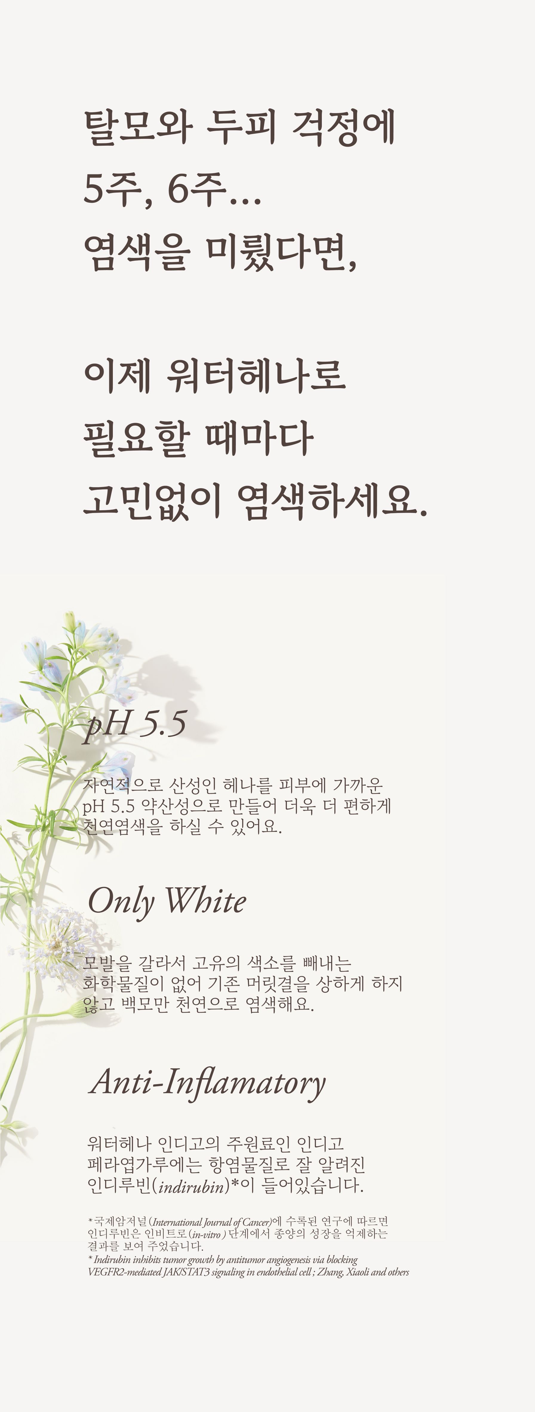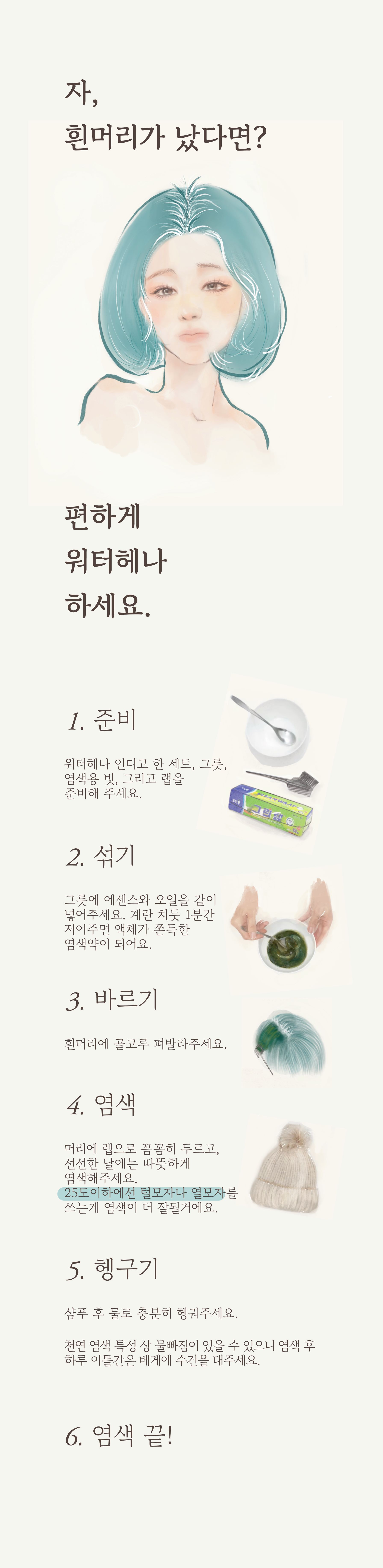 - 오일과 에센스를 그릇에 부은 후 1분간 잘 섞어주세요. 흰머리에 고루 바른 후 랩을 두른 뒤, 열모자(겨울철)을 쓴 후 30~40분 정도 기다려 주세요. 샴푸 후 머리를 잘 헹구어주세요. 24시간 후 색이 더 진해집니다.