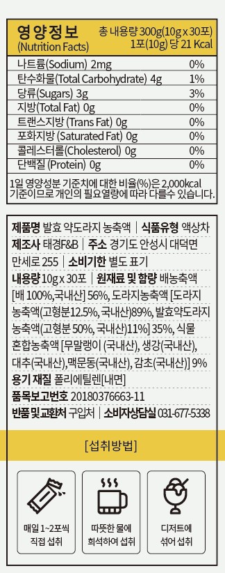 배농축액[배 100%,국내산], 도라지농축액[도라지농축액(고형분 12.5%, 국내산)89%, 발효약도라지농축액(고형분 50%, 국내산)11%]35%, 식물혼합농축액[무말랭이(국내산), 생강(국내산), 대추(국내산), 맥문동(국내산), 감초(국내산)]