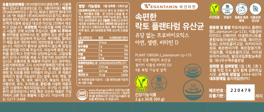 락토바실러스 플랜타럼(L.plantarum Lp-115), 식물성비타민D3, 산화아연, 아셀렌산나트륨혼합제제(아셀렌산나트륨, 제이인산칼슘), 프락토올리고당, 치커리식이섬유, 볶은현미가루, 볶은찹쌀가루, 자일리톨, 자일로올리고당, 식이섬유아카시아검, 열대과일혼합농축분말, 대나무수액추출분말