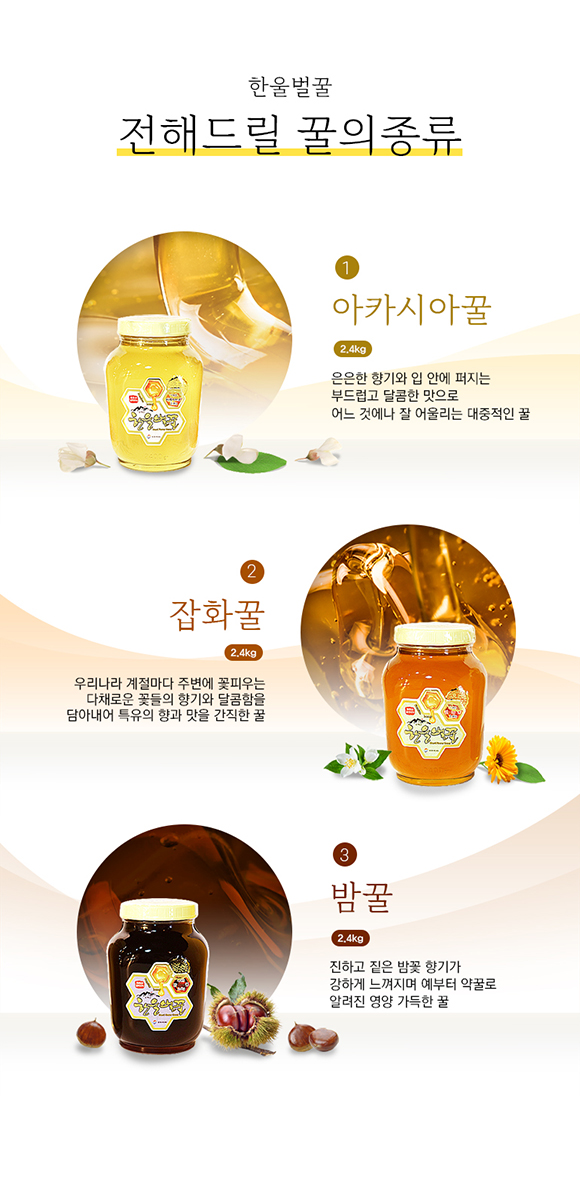 [한울벌꿀] 국내산 프리미엄 자연산 100% 아카시아꿀, 잡화꿀, 밤꿀 2.4kg