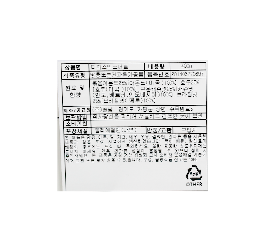 본 제품은 공정거래위원회 고시 소비자 분쟁 해결 기준에 의거 교환 또는 보상 받을 수 있습니다. - 본 제품은 땅콩, 견과류 등을 사용한 제품과 같은 포장시설에서 생산하였습니다. - 땅콩 등 견과류에 알레르기 반응이 있는 분들이 섭취할 경우 알레르기 증상을 일으킬 수 있으니 주의하시기 바랍니다. (부정.불량식품 신고는 국번없이 1399)