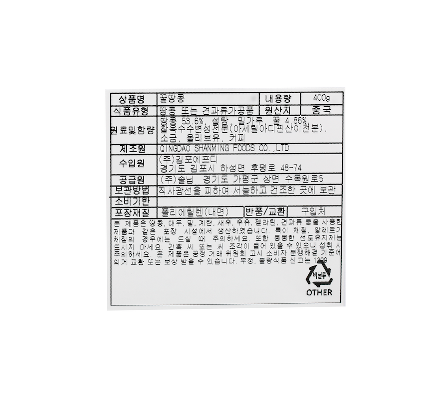본 제품은 공정거래위원회 고시 소비자 분쟁 해결 기준에 의거 교환 또는 보상 받을 수 있습니다. - 본 제품은 땅콩, 견과류 등을 사용한 제품과 같은 포장시설에서 생산하였습니다. - 땅콩 등 견과류에 알레르기 반응이 있는 분들이 섭취할 경우 알레르기 증상을 일으킬 수 있으니 주의하시기 바랍니다. (부정.불량식품 신고는 국번없이 1399)