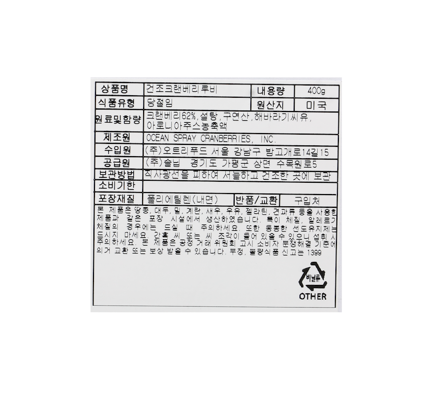 크랜베리 62%, 설탕, 구연산, 아로니아주스 농축액, 해바라기씨유(미국산)