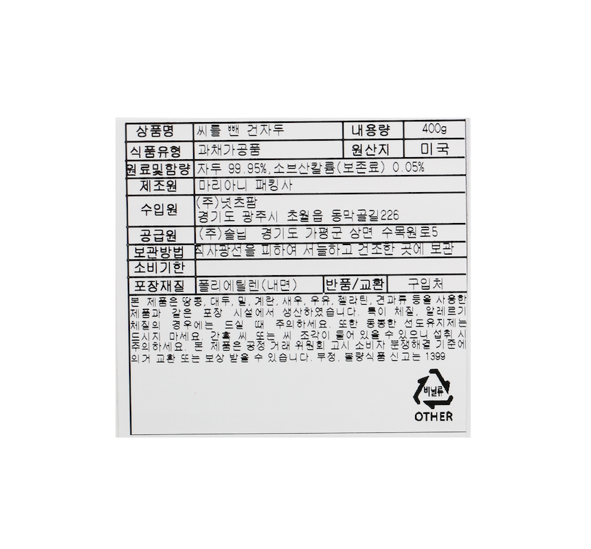 본 제품은 공정거래위원회 고시 소비자 분쟁 해결 기준에 의거 교환 또는 보상 받을 수 있습니다. - 본 제품은 땅콩, 견과류 등을 사용한 제품과 같은 포장시설에서 생산하였습니다. - 땅콩 등 견과류에 알레르기 반응이 있는 분들이 섭취할 경우 알레르기 증상을 일으킬 수 있으니 주의하시기 바랍니다. (부정.불량식품 신고는 국번없이 1399)