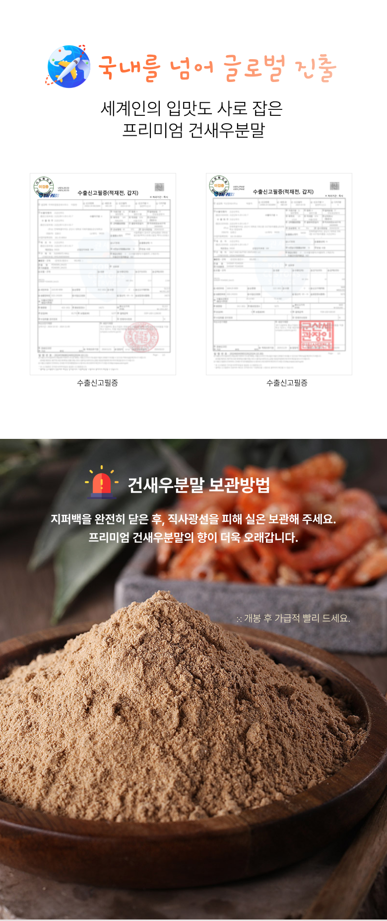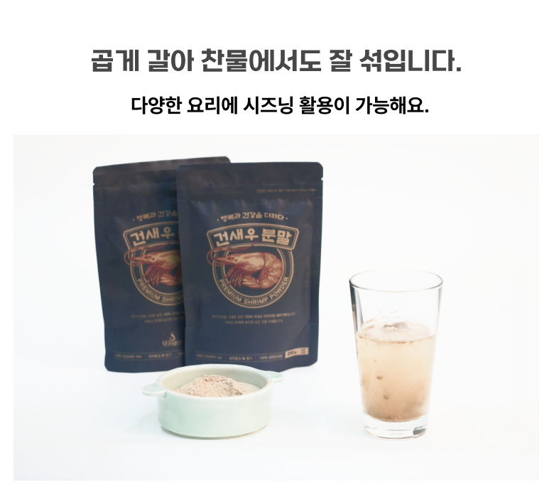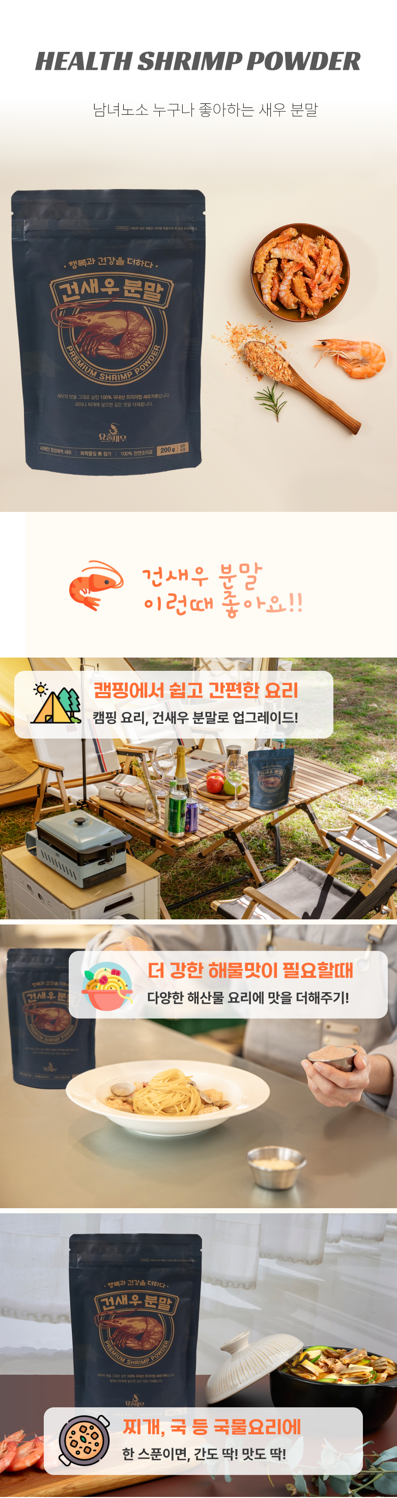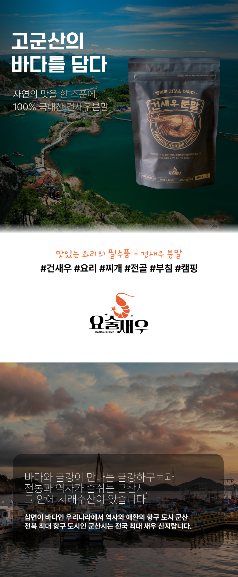 전국 최대 새우 산지, 군산 새우로 만든 100% 천연조미료, 화학물질, 방부제, 색소 등 유해물질 NO, 풍미와 선도 입자가 고와서 국물 요리는 물론, 밀가루 반죽에 넣어 부침개, 각종 전 그리고 새우 시즈닝으로 감칠맛을 더할 수 있는 새우가루