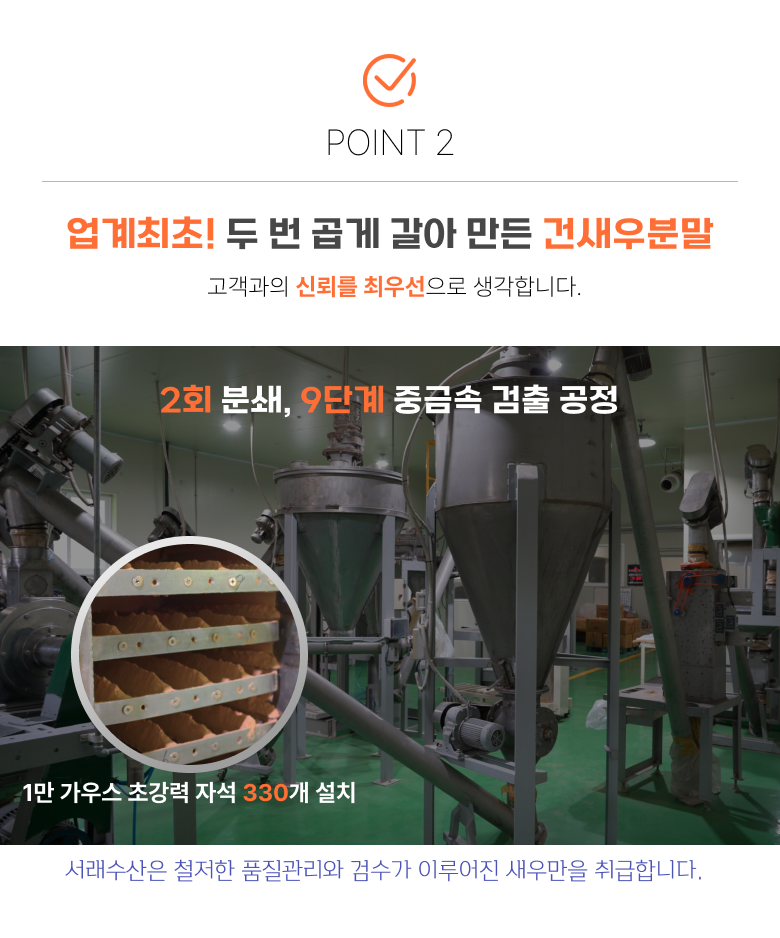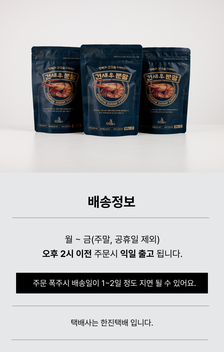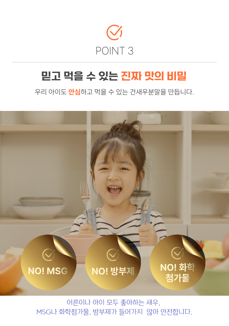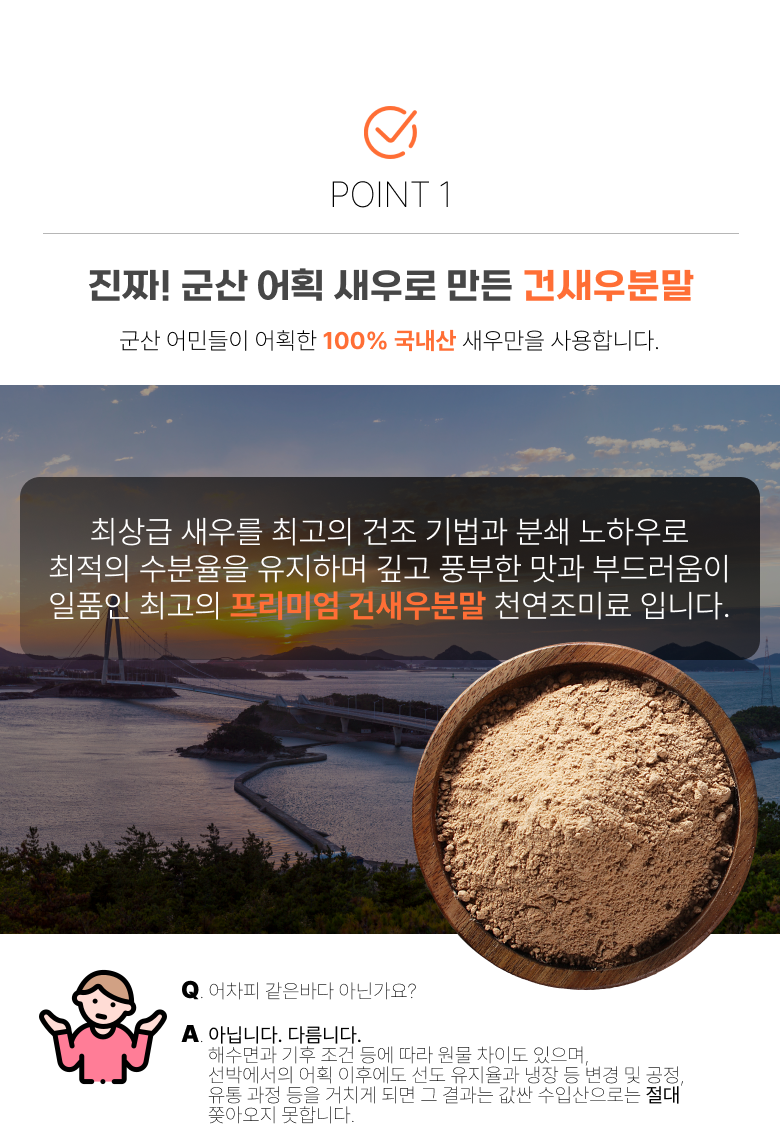 전국 최대 새우 산지, 군산 새우로 만든 100% 천연조미료, 화학물질, 방부제, 색소 등 유해물질 NO, 풍미와 선도 입자가 고와서 국물 요리는 물론, 밀가루 반죽에 넣어 부침개, 각종 전 그리고 새우 시즈닝으로 감칠맛을 더할 수 있는 새우가루