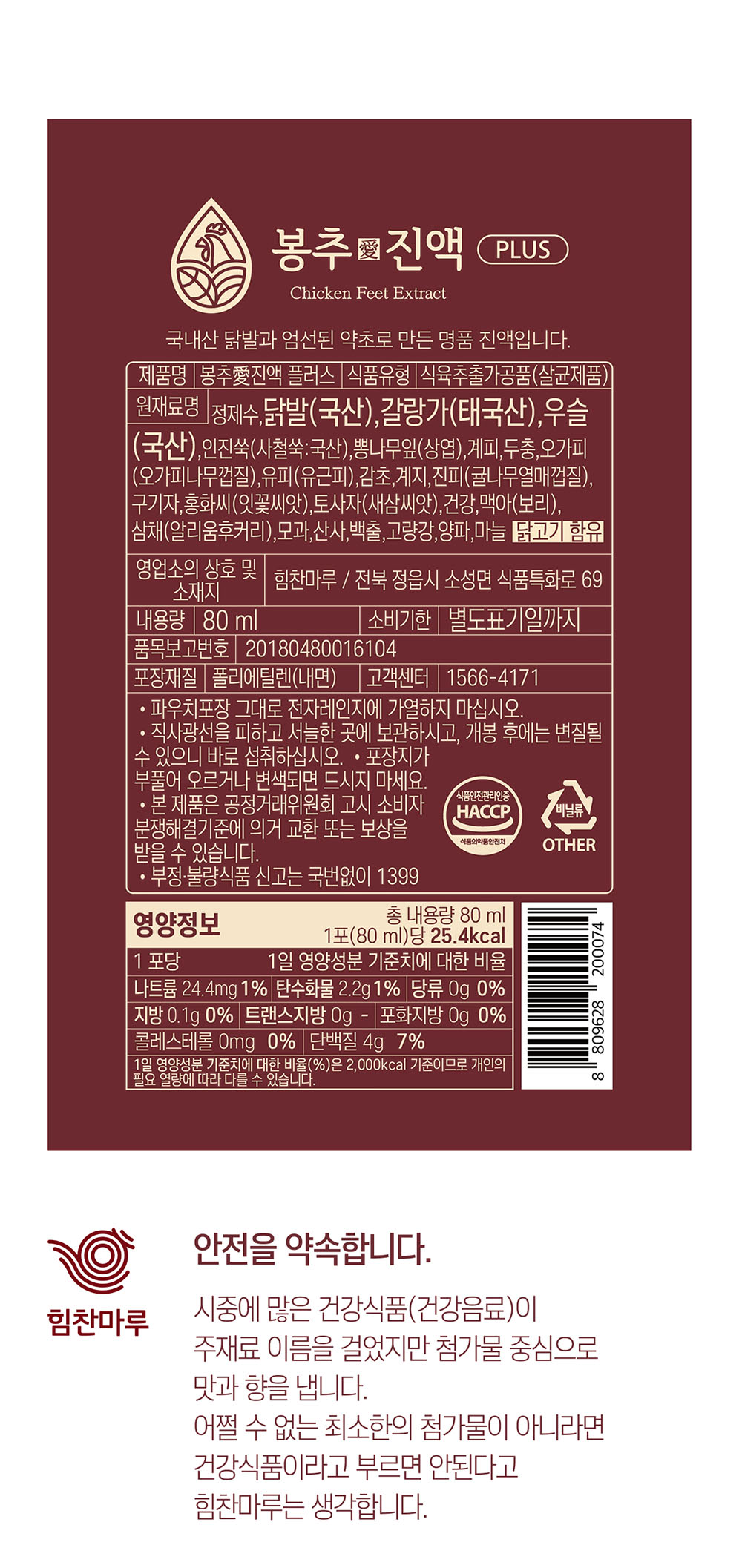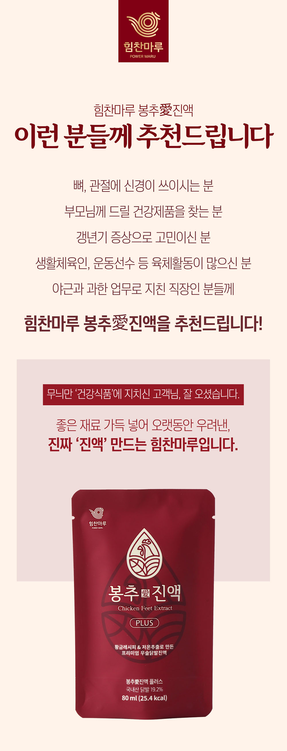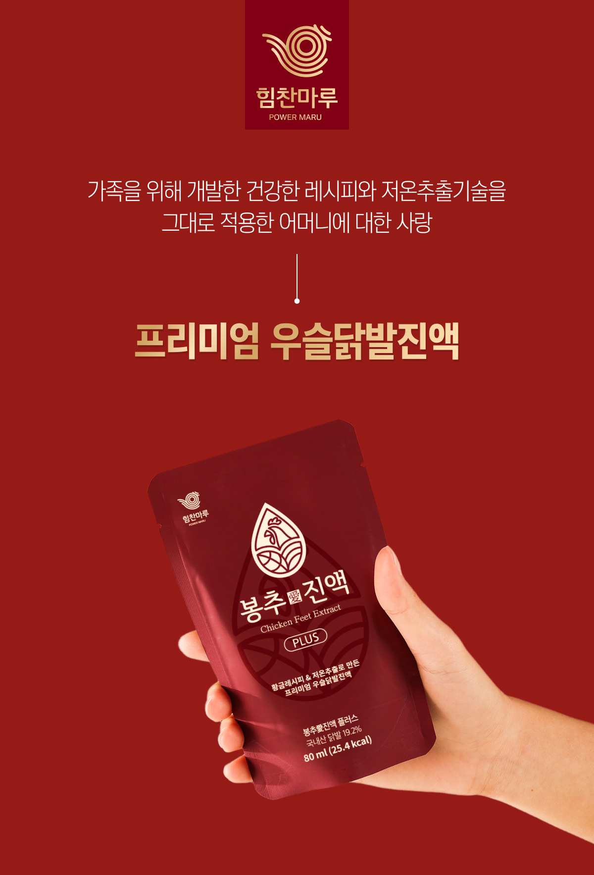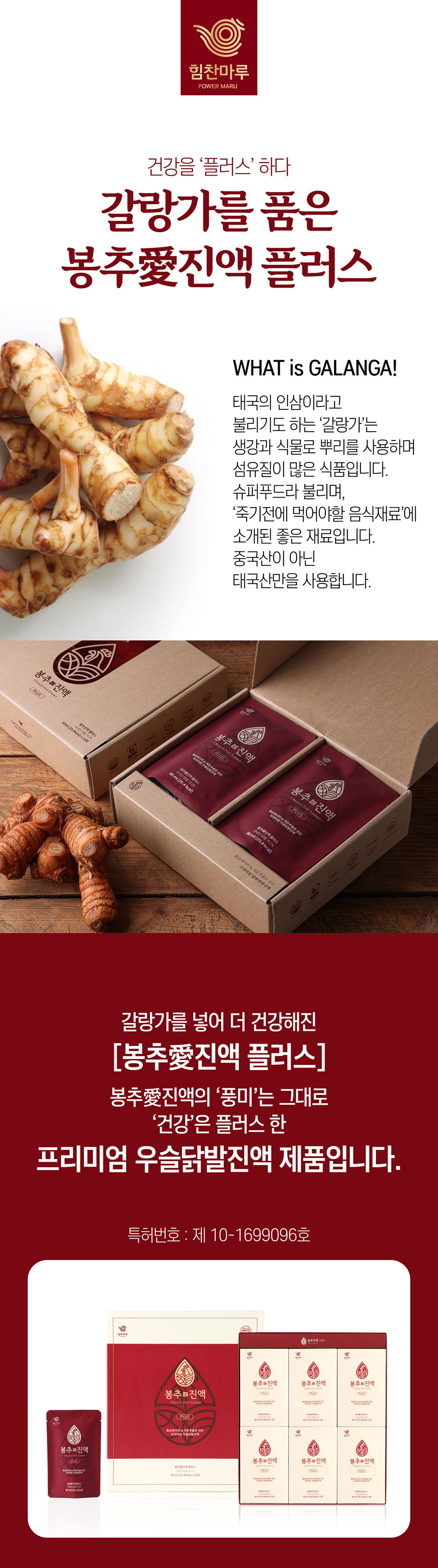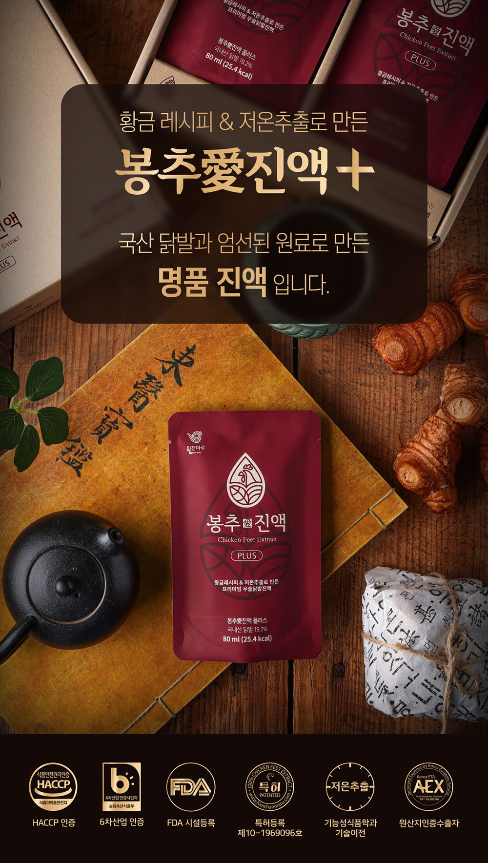 기존 봉추진액에 갈랑가(Galanga)를 넣어 더 건강해진 봉추진액 플러스는 봉추진액의 '풍미'는 그대로 '건강'은 플러스 한 최고급 프리미엄 닭발 진액 제품입니다.