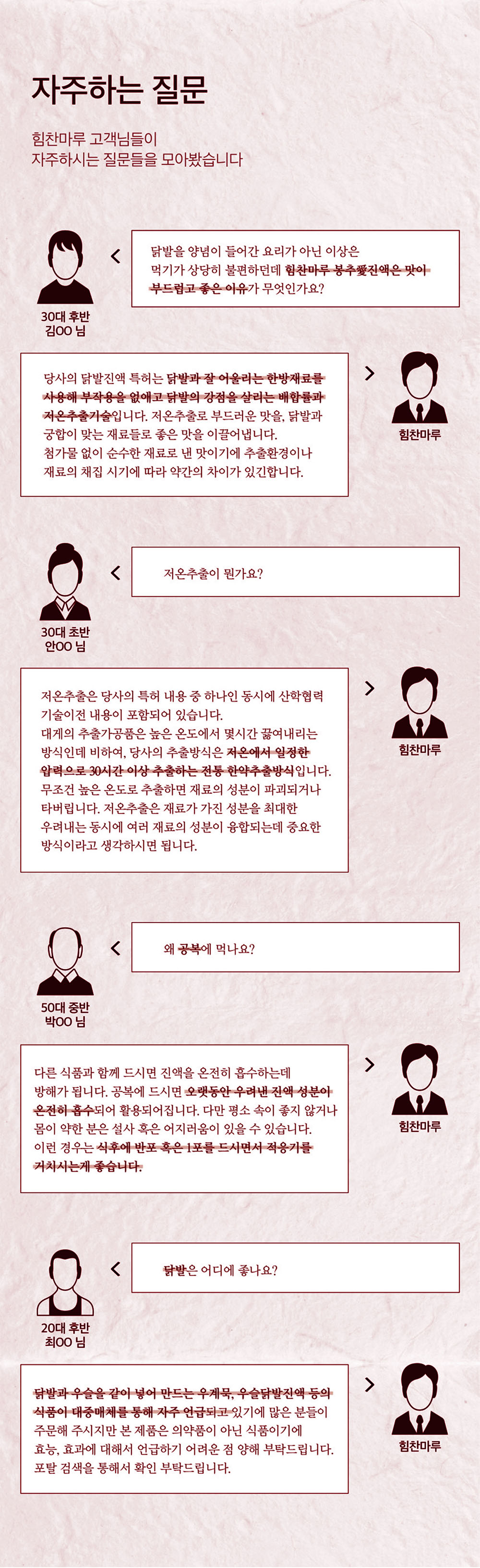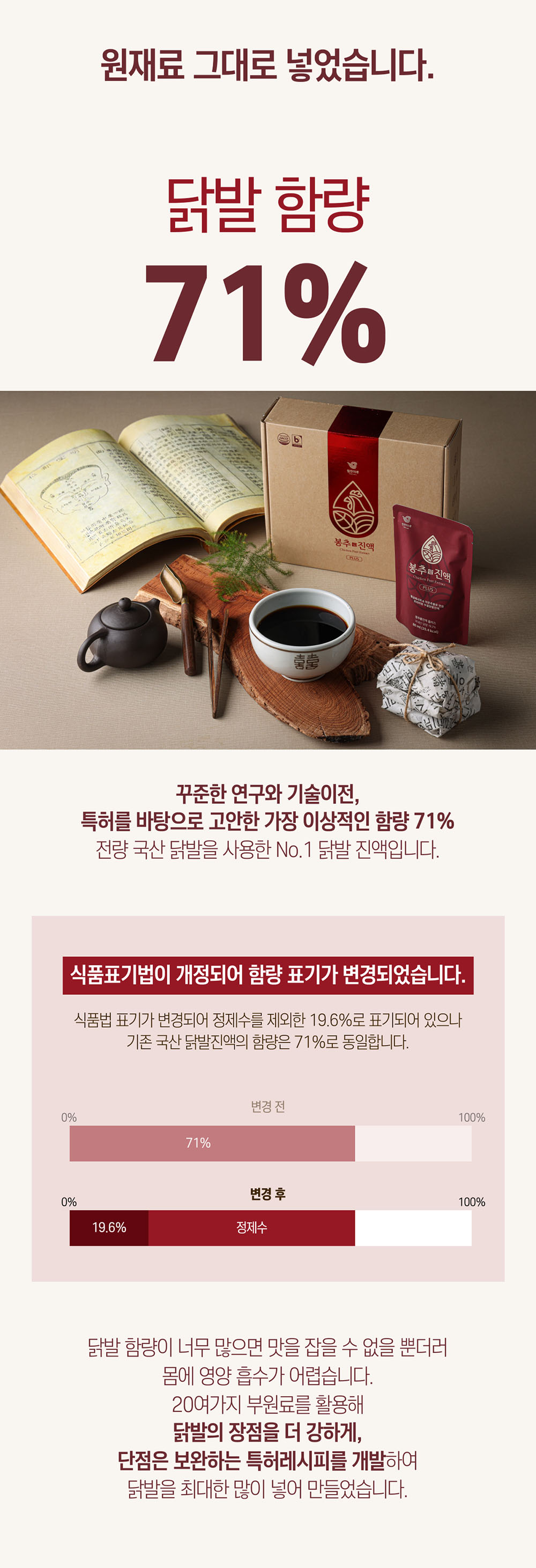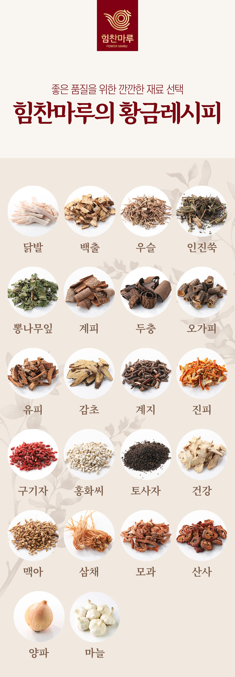 닭발66.3%(국산) 갈랑가4.4%(태국) 우슬(국산) 인진(국산) 뽕잎(국산) 양파(국산) 두충 진피 계피 유피 구기자 홍화씨 토사자 감초 오가피 계지 모과 삼채 맥아 산사 백출 건강