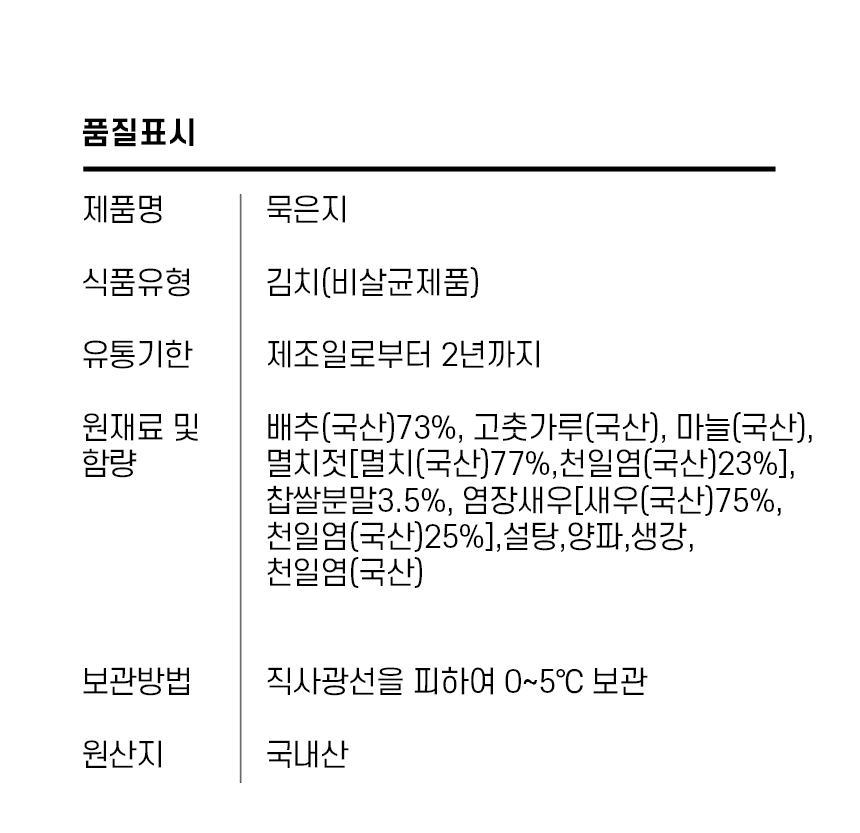 배추(국산)73%, 고춧가루(국산), 마늘(국산), 멸치젓[멸치(국산)77%,천일염(국산)23%], 찹쌀분말3.5%, 염장새우[새우(국산)75%,천일염(국산)25%], 설탕, 양파, 생강, 천일염(국산)