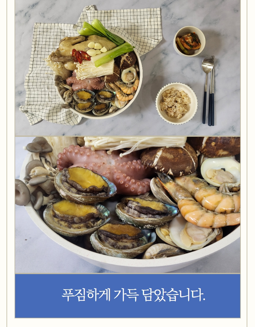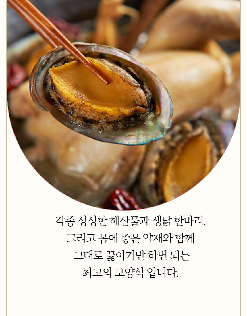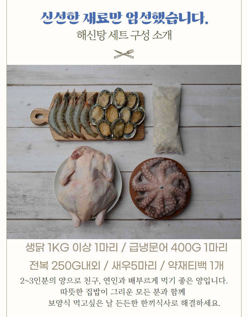 생닭1kg이상(1마리/ 국내산), 급냉 문어 400g이상(1마리/ 세네갈, 모리타니아산), 전복 250g내외(국내산), 새우5마리(페루산), 백숙한약재1팩(국내산)