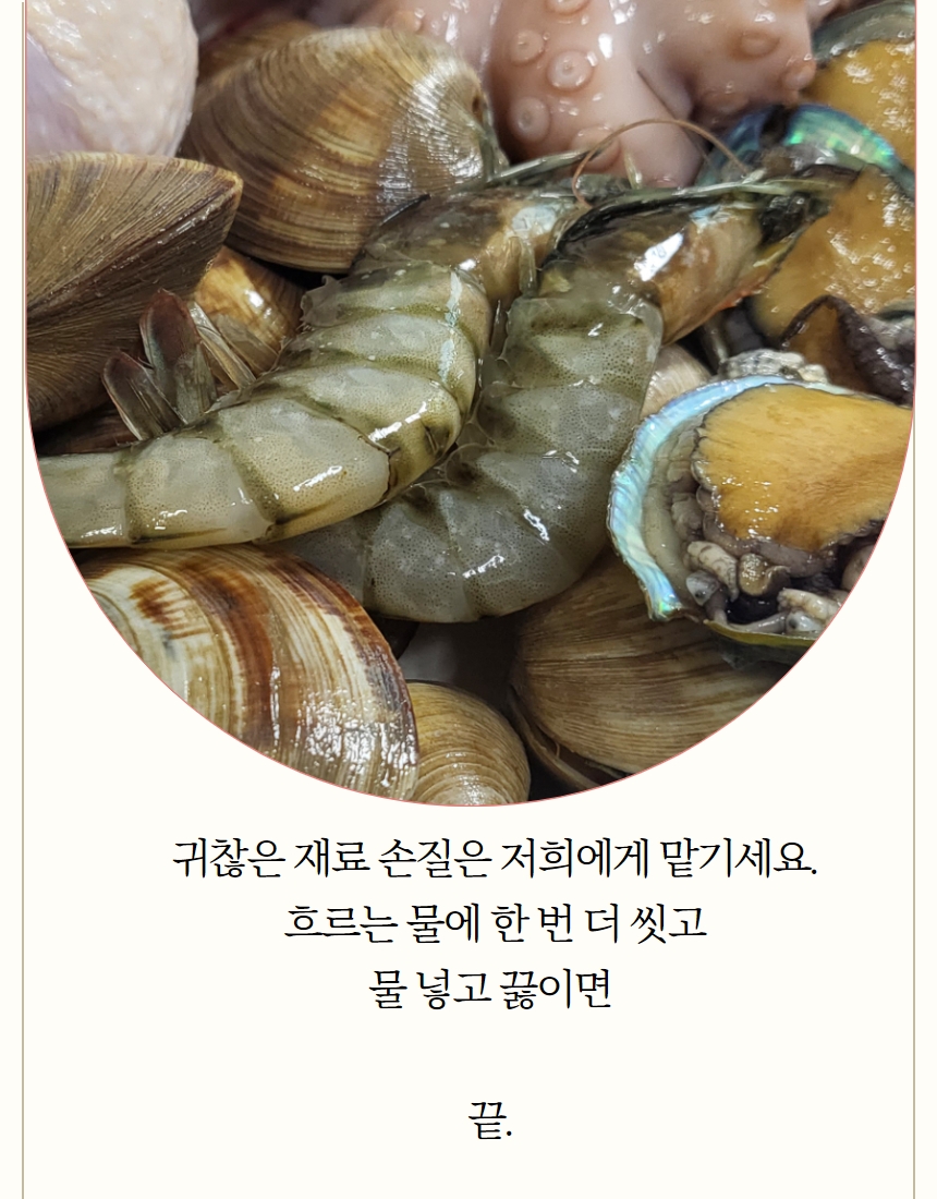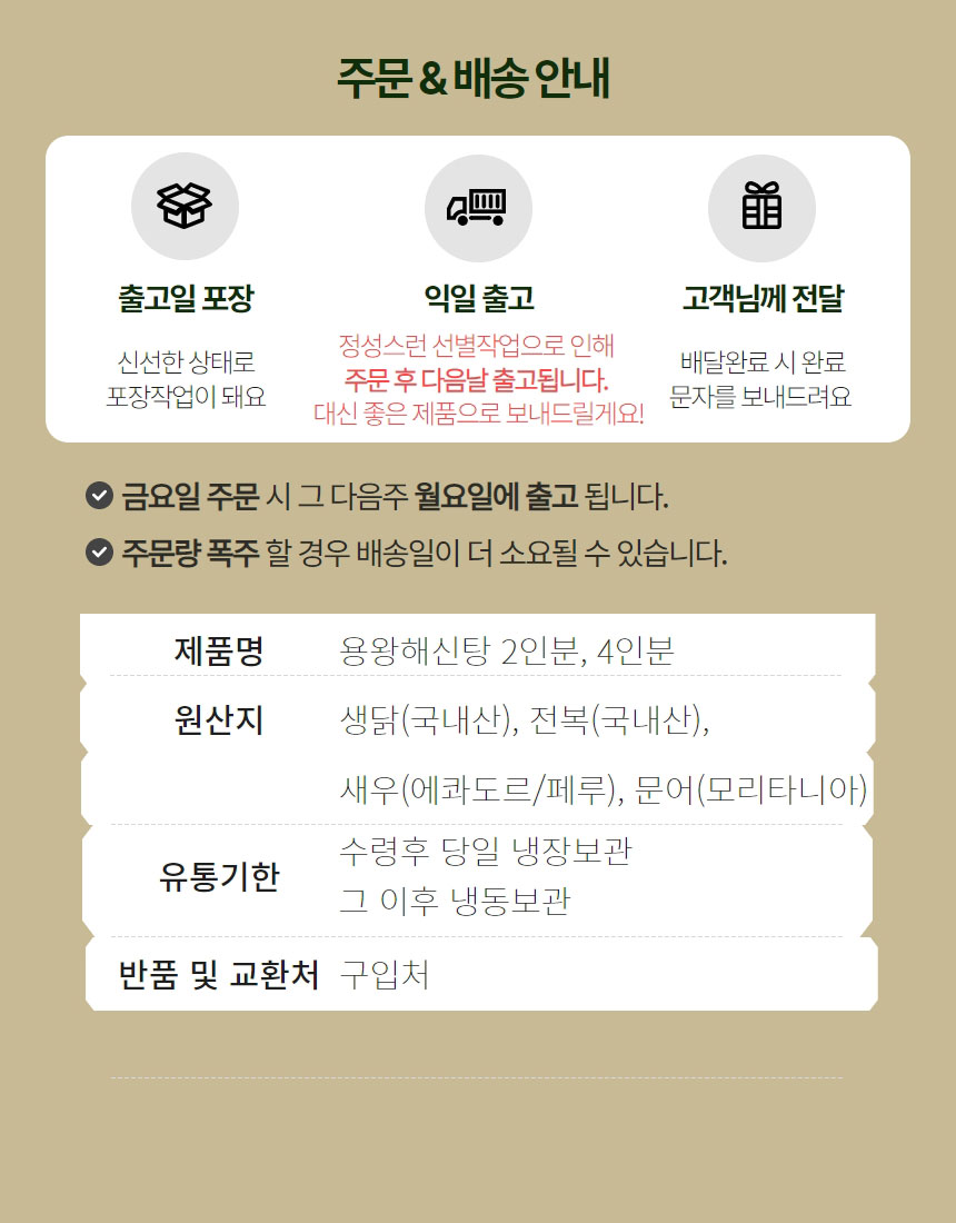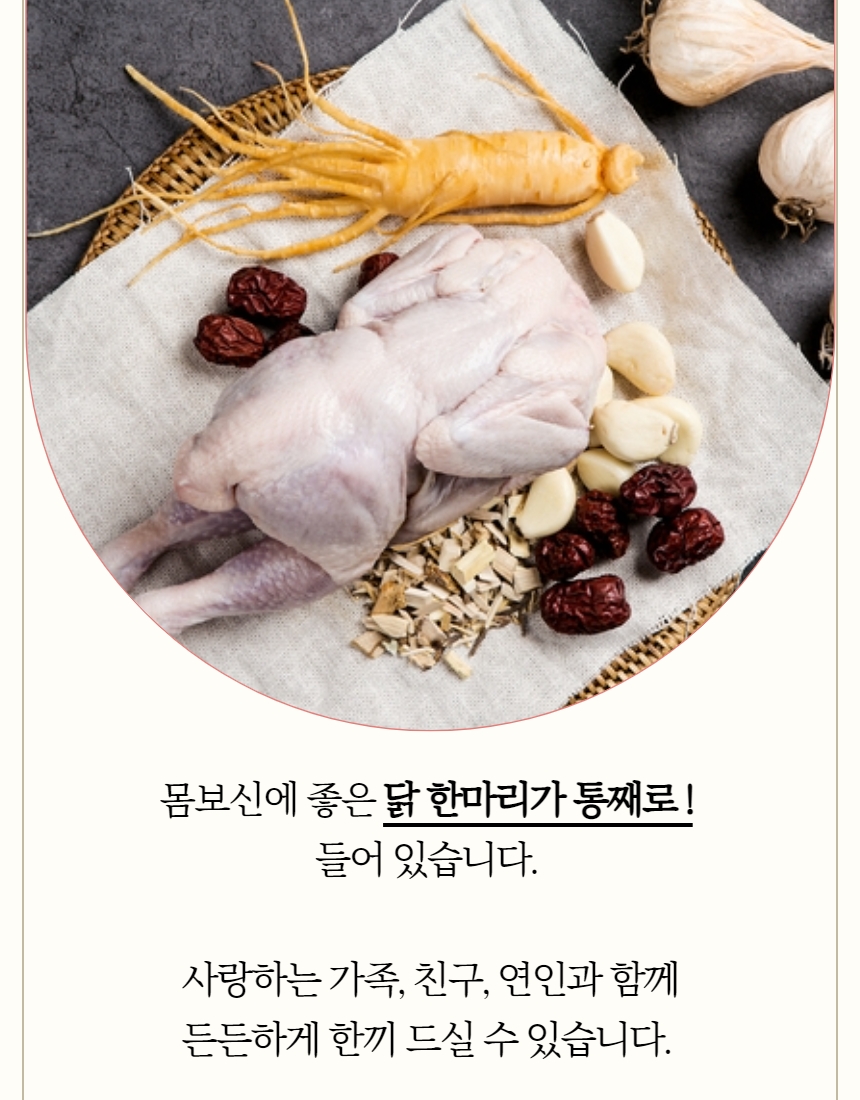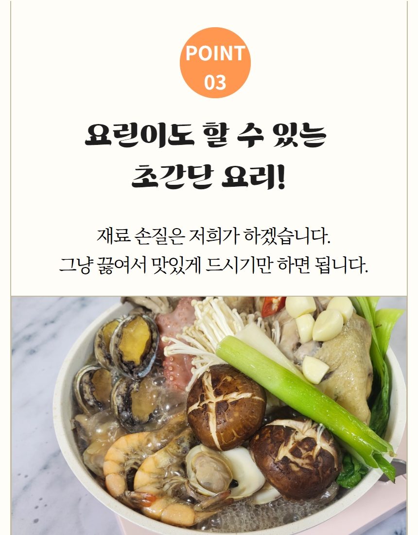 생닭1kg이상(1마리/ 국내산), 급냉 문어 400g이상(1마리/ 세네갈, 모리타니아산), 전복 250g내외(국내산), 새우5마리(페루산), 백숙한약재1팩(국내산)