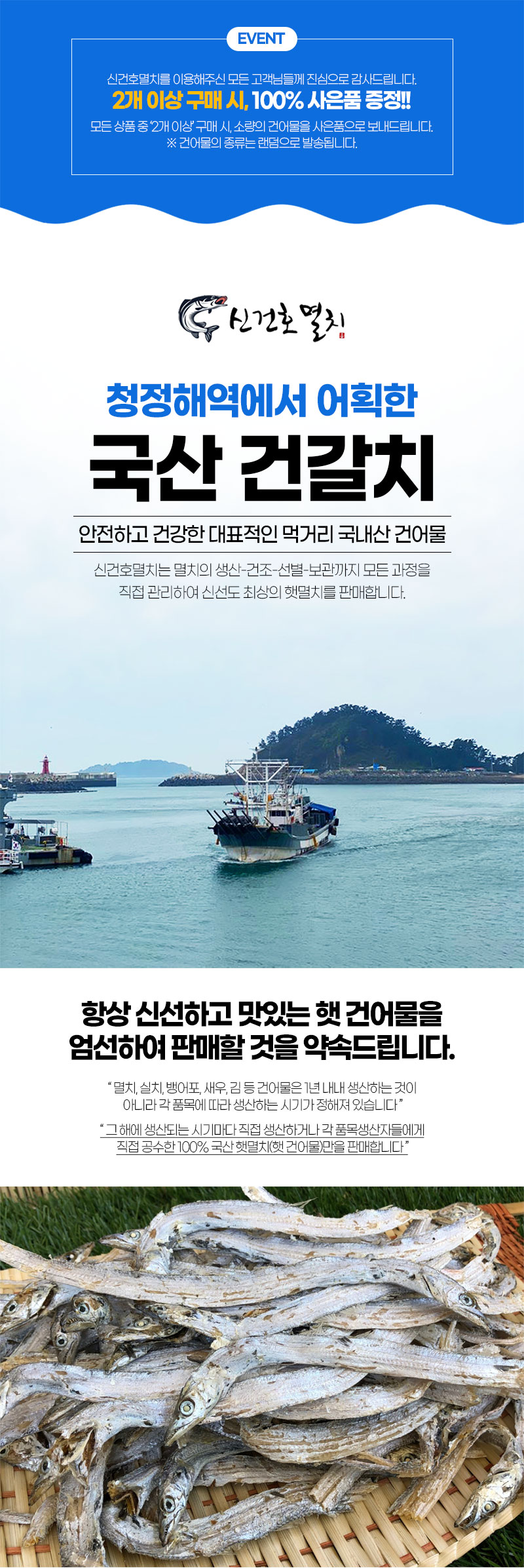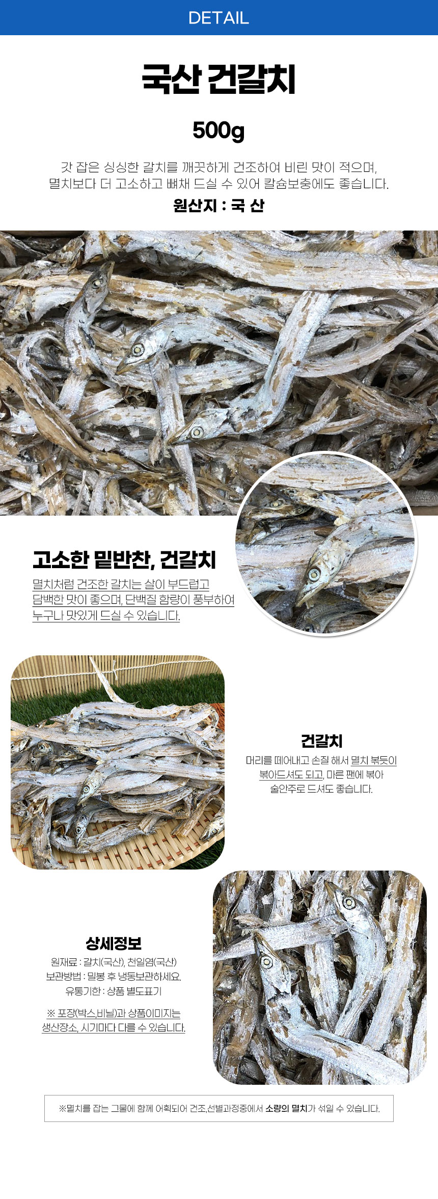 멸치처럼 건조한 건갈치는 살이 부드럽고 담백한 맛이 좋으며, 단백질 함량이 풍부하여 누구나 맛있게 드실 수 있습니다.