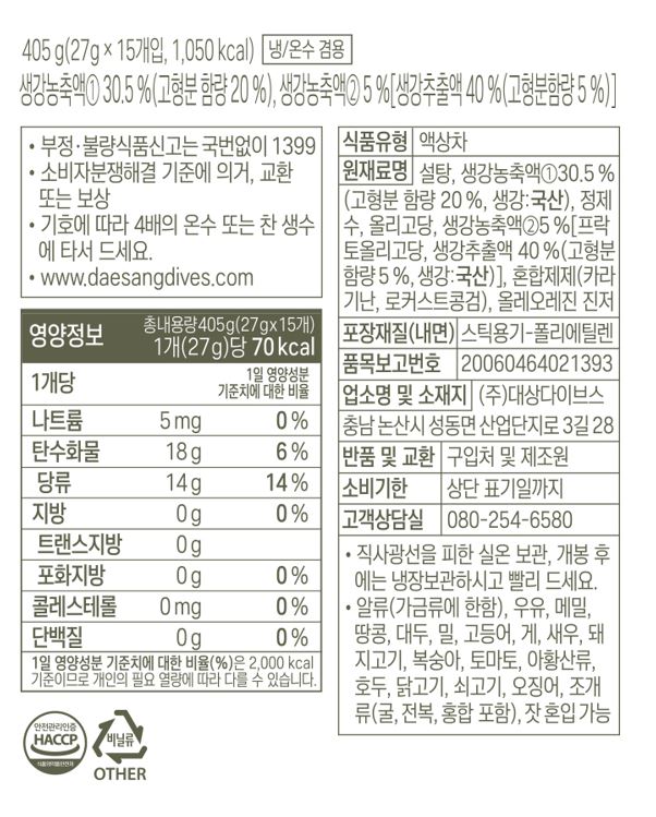 설탕, 생강농축액 30.5%(고형분 함량 20%, 생강:국산), 정제수, 올리고당, 생강농축액 5%[프락토올리고당, 생강추출액 40%(고형분함량 5%, 생강:국산)], 혼합제제(카라기난, 로커스트콩검), 올레오레진 진저