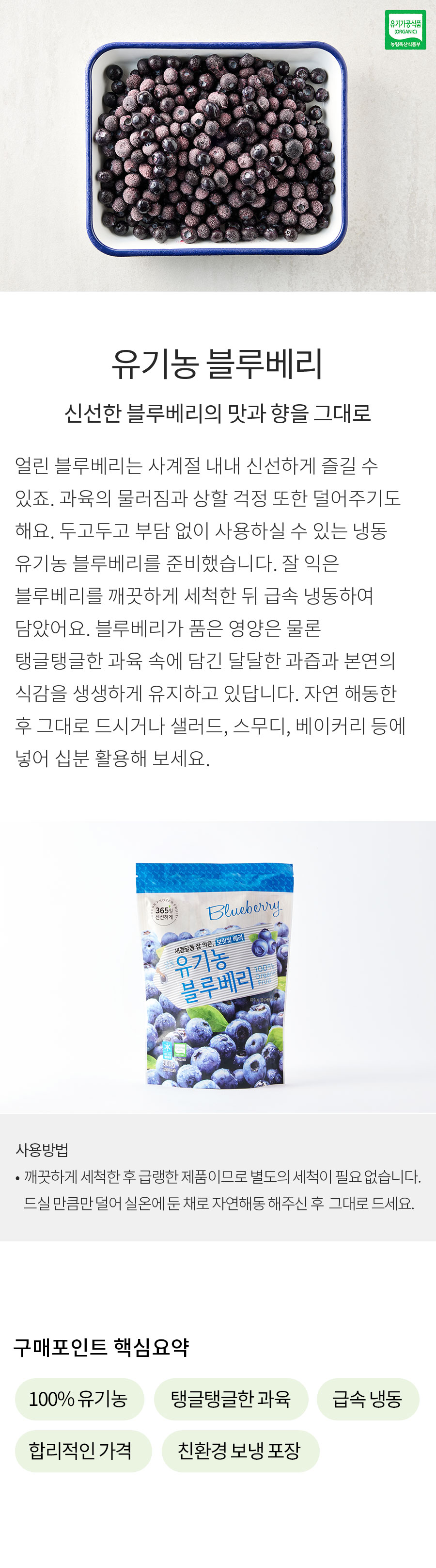 유기농 블루베리 (500g,냉동) 수량빼기 수량추가 11,900 원 총 수량 1 개 11,900 원 구매옵션 닫기 찜하기 추가 찜하기 삭제 구매후기 9,249 상품상세 정기구독 장바구니 정기구독 장바구니 구매하기 정기배송 장바구니