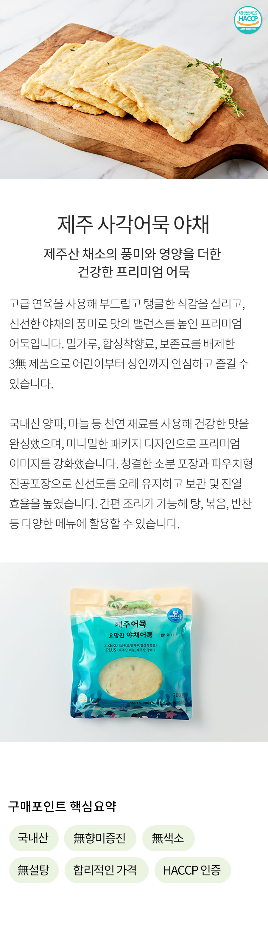 제주 요망진 야채어묵 (300g 이상) 수량빼기 수량추가 봉지 5,800 원 총 수량 1 개 5,800 원 구매옵션 닫기 찜하기 추가 찜하기 삭제 구매후기 231 상품상세 정기구독 장바구니 정기구독 장바구니 구매하기 정기배송 장바구니