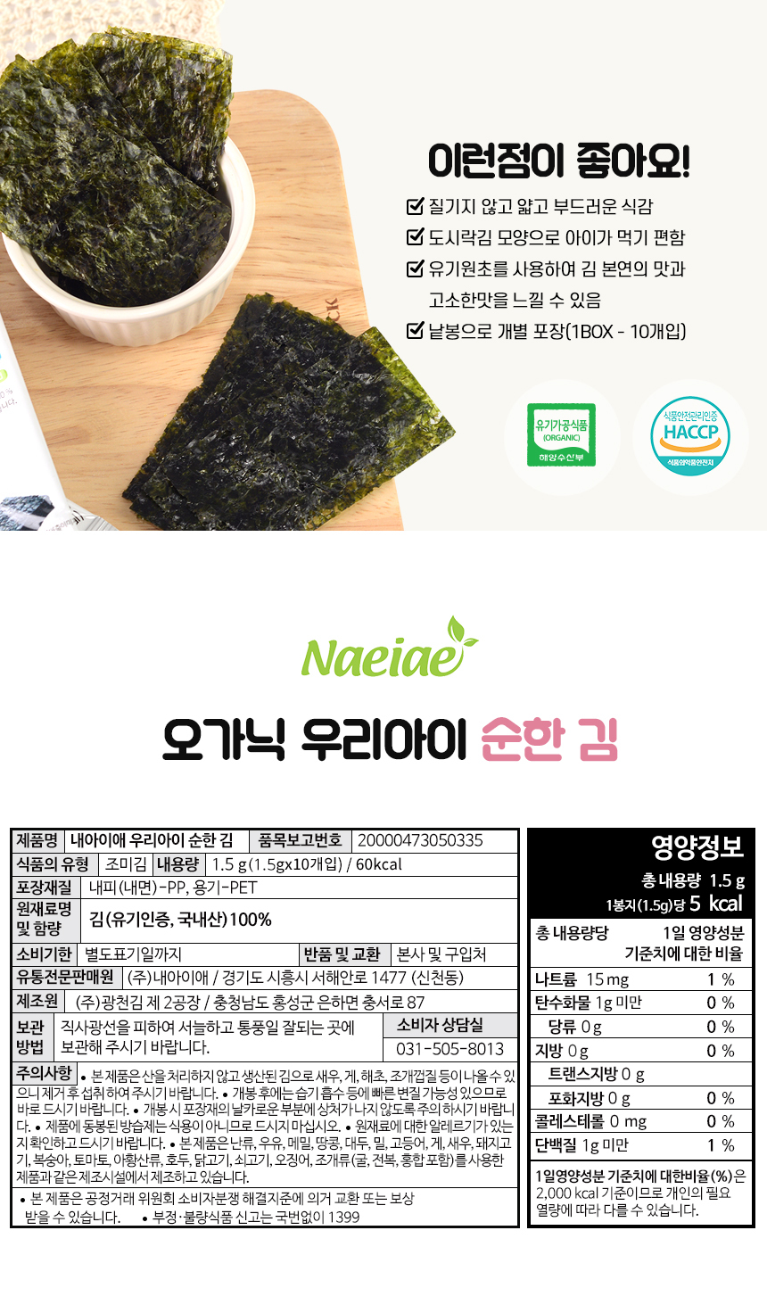 국내산 유기농 원초만을 사용하여 만든 우리아이 김